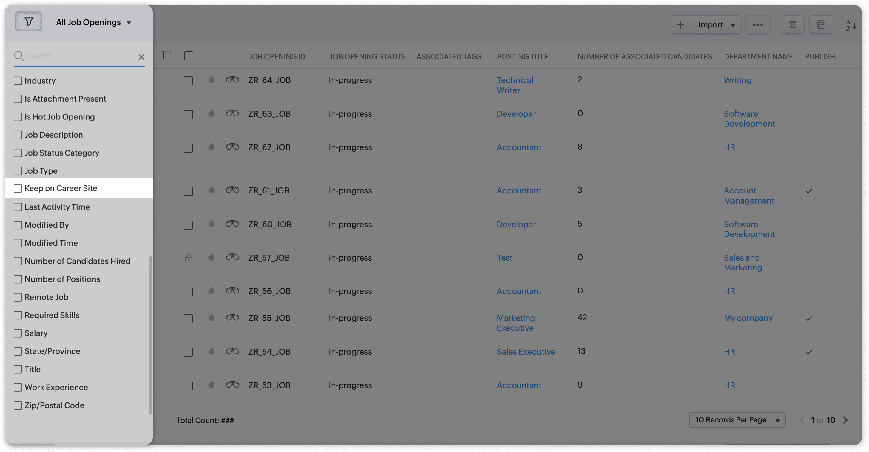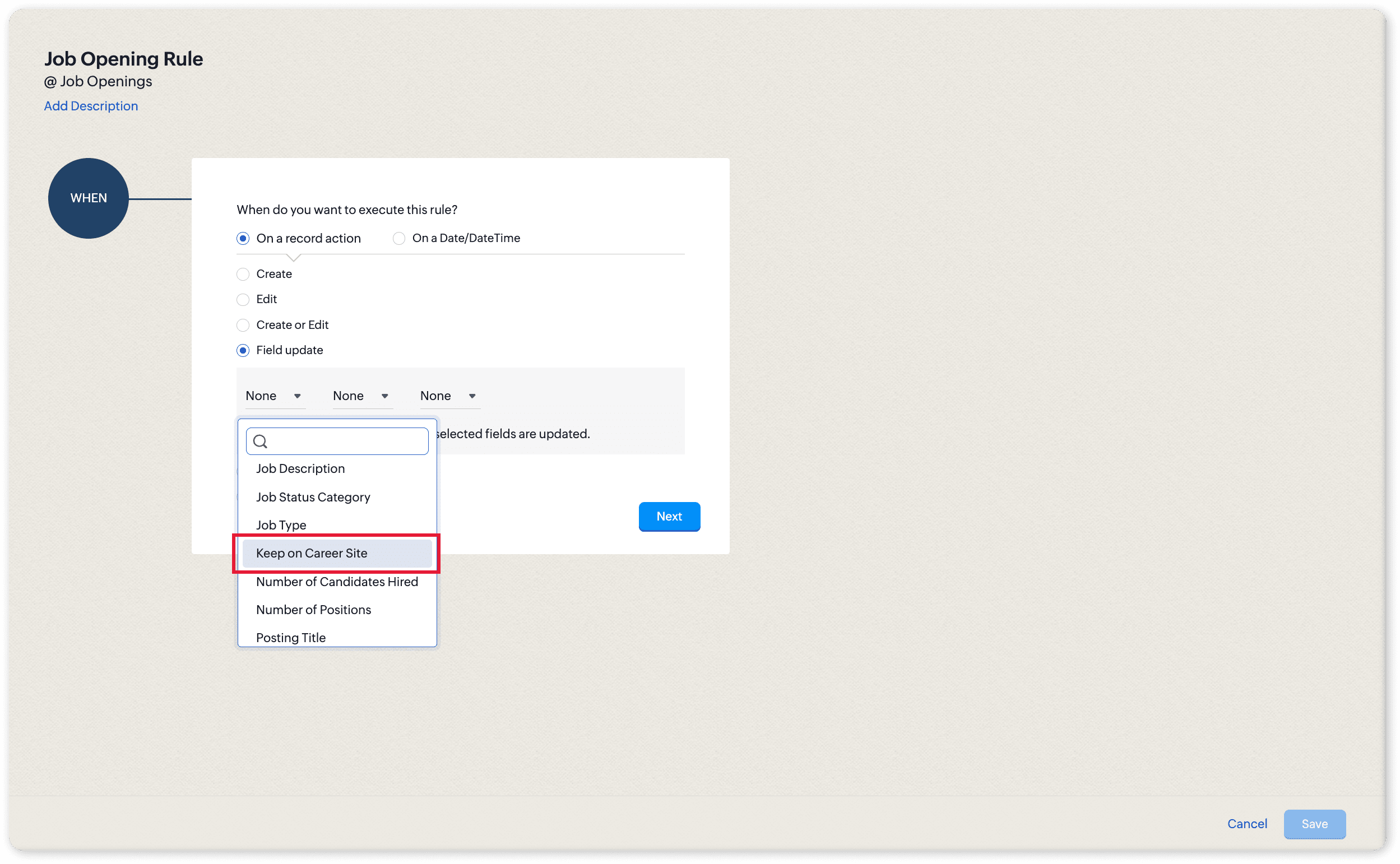 When creating a workflow or automation rule in Zoho Recruit for job openings, one of the options is to trigger the rule when the Keep on Career Site field is updated for a particular job opening record. Get notified when the preference/option to retain a job on the careers site is modified or opted out.