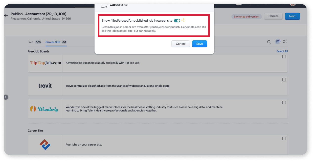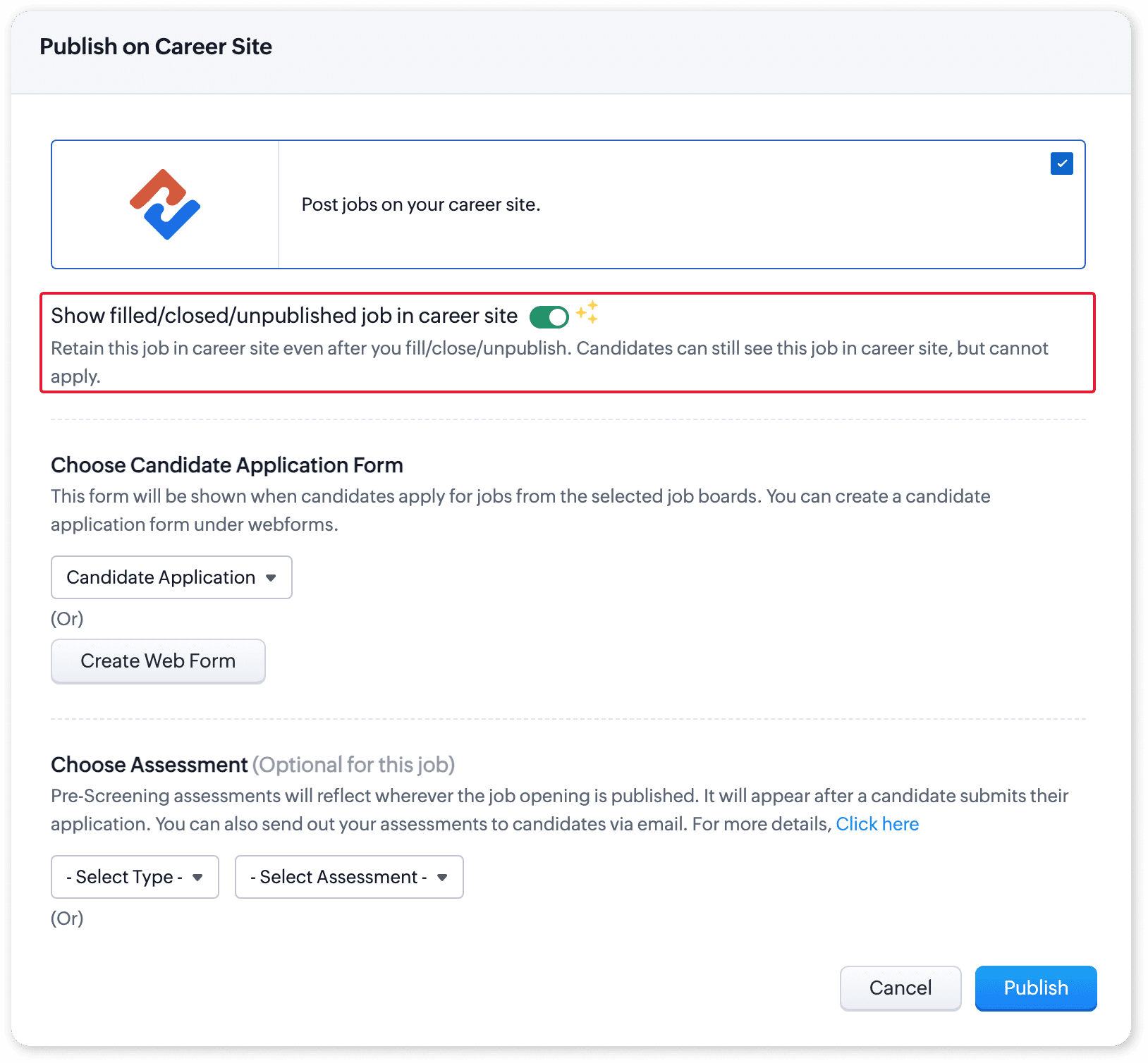 - In the interface that appears, there is a toggle button to enable showing filled/closed/unpublished jobs on the career site.