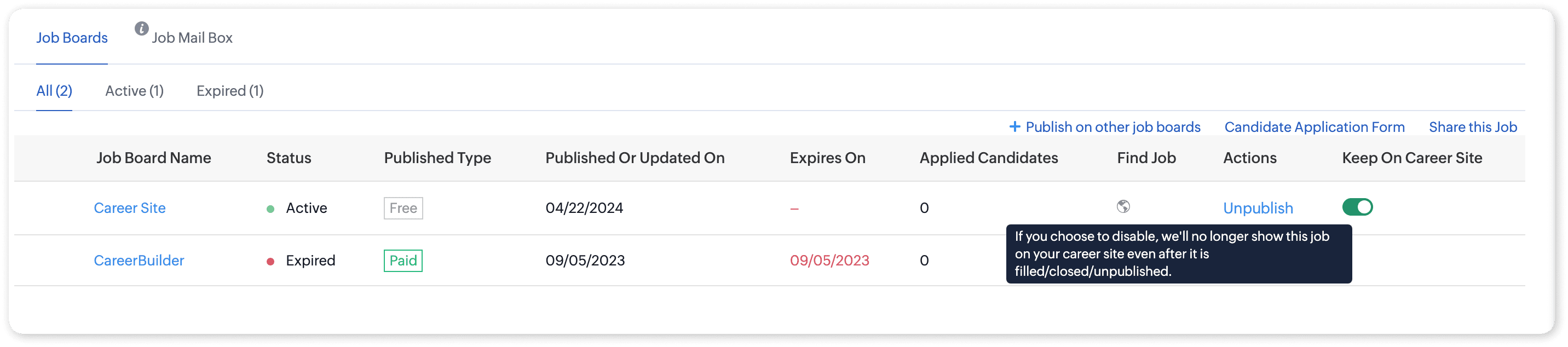 This Keep on Career site filters the the list of jobs where the retain on career site after closure/unpublish option is activated.