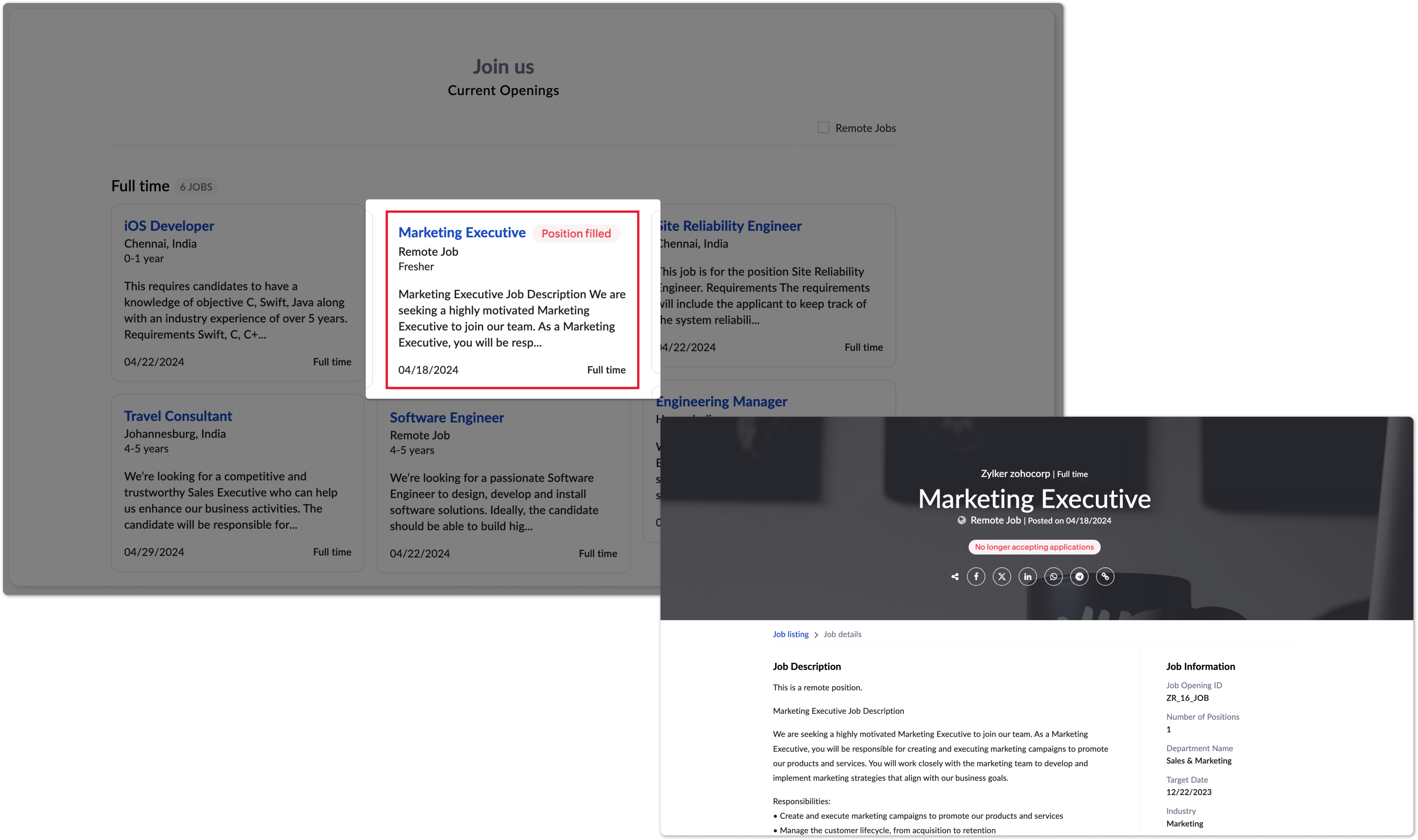 Candidates who previously applied for a closed position can track the status of their application and understand when a role has been filled, fostering transparency and trust in your recruitment process.