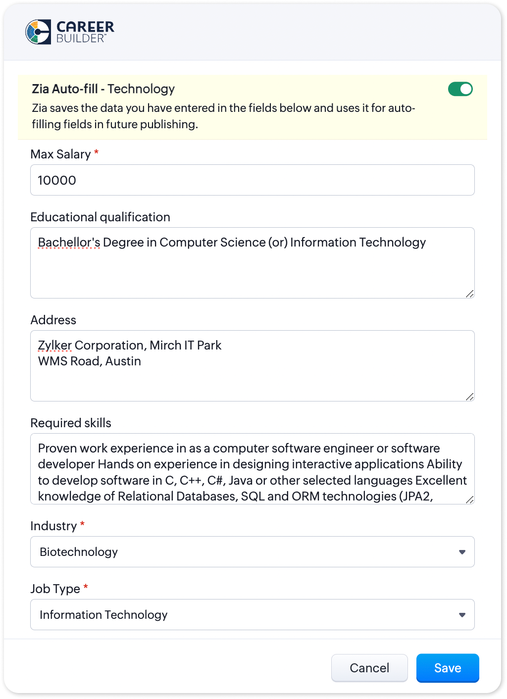 Target your job posts better, ensure your posts match your branding guidelines and optimize your campaign ROI with Career Builder. Zoho Recruit's integration with Career Builder allows your organization to publish jobs to the Career Builder platform ...