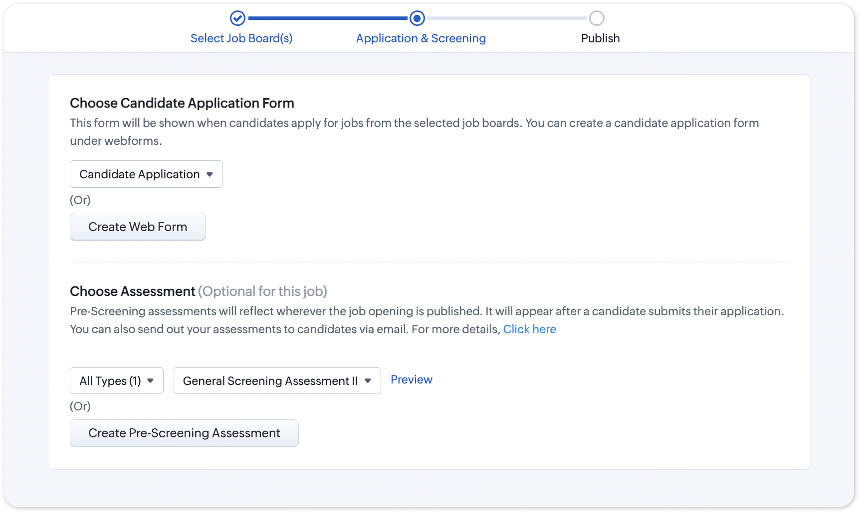 1. In the Publish on Career Site pop-up, you will have the option to choose the Candidate Application form and a Pre-screening Assessment.