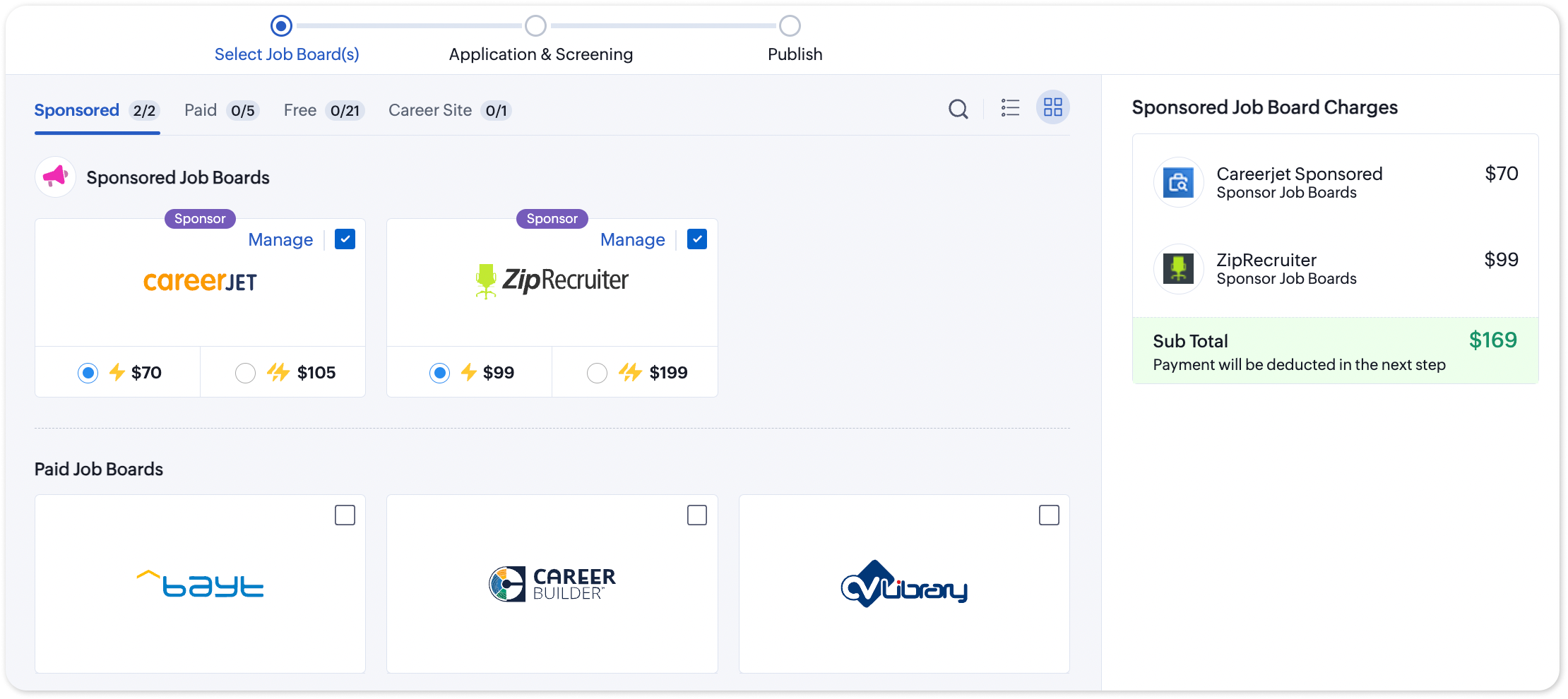 1. You can find all the job boards you have activated in the center-console. For sponsored job boards, the total charges you will incur will be displayed on the left.