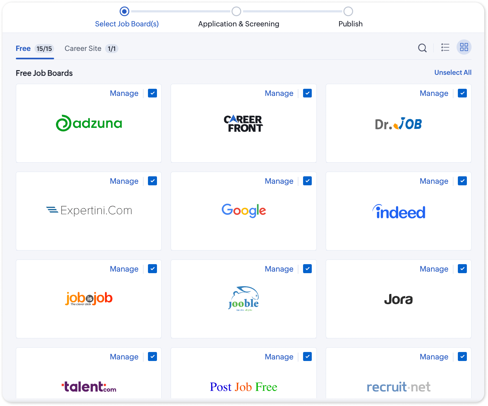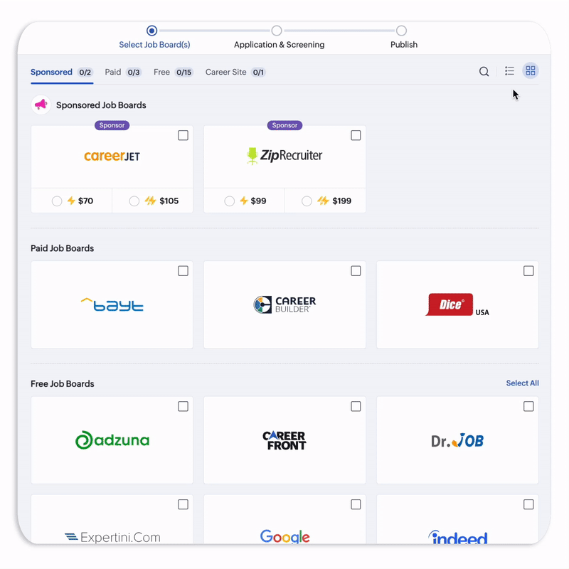 When you're selecting job boards to publish, you will have two view options, namely, List View and Grid View. You can switch between both views using their respective icons on the top-left.