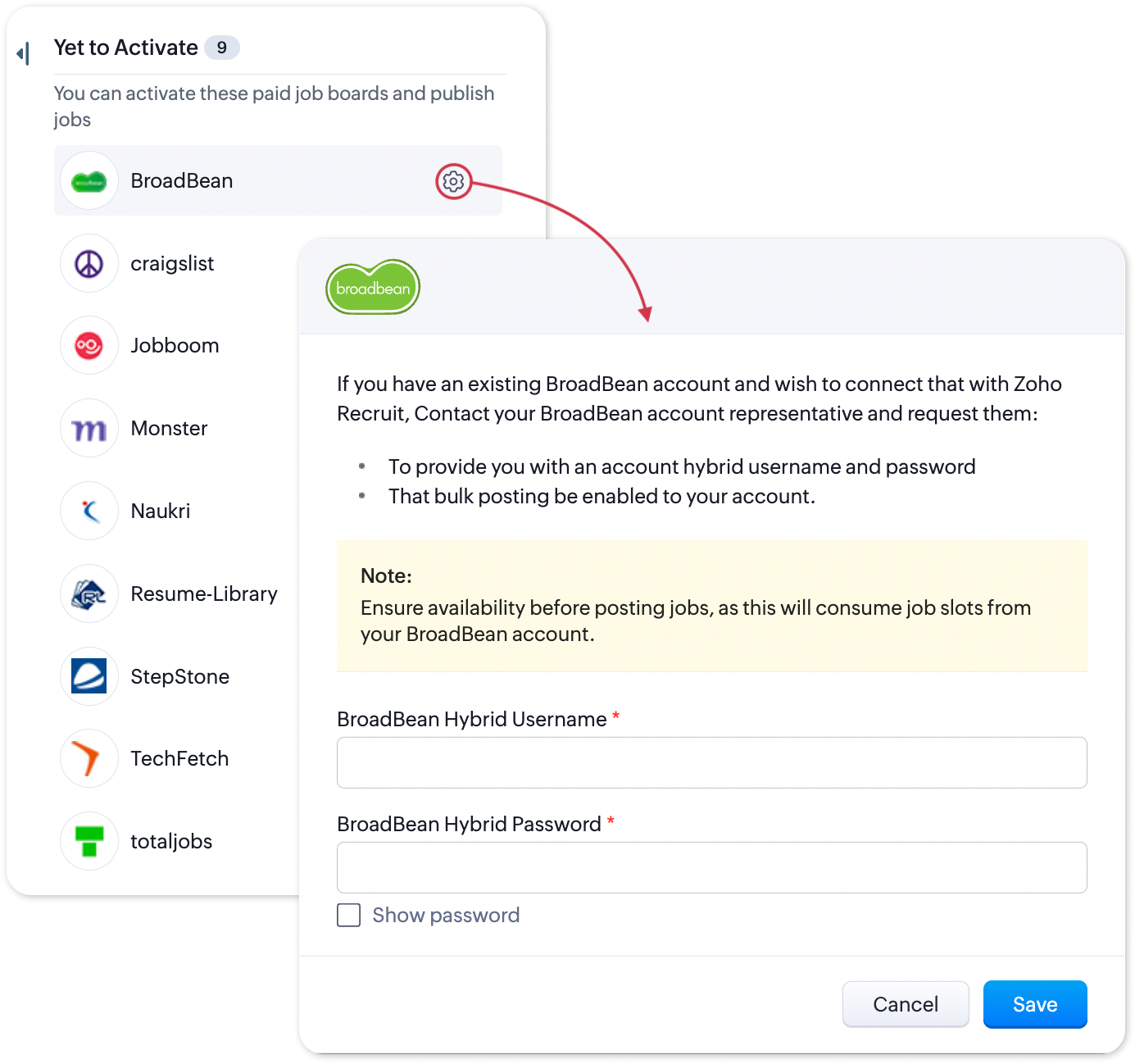 The Yet to Activate tab lists all the paid job boards that haven't been activated. Click the Configure icon and enable the job boards of your choice directly from the job publishing wizard.