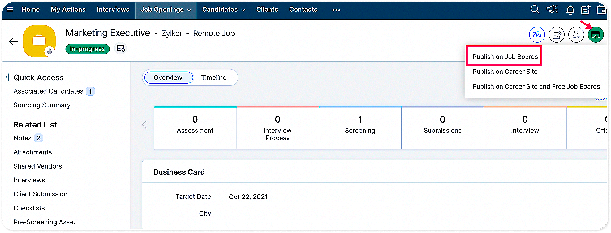 1. From the Job Openings module, go to the Job you wish to publish and click the Publish  icon.