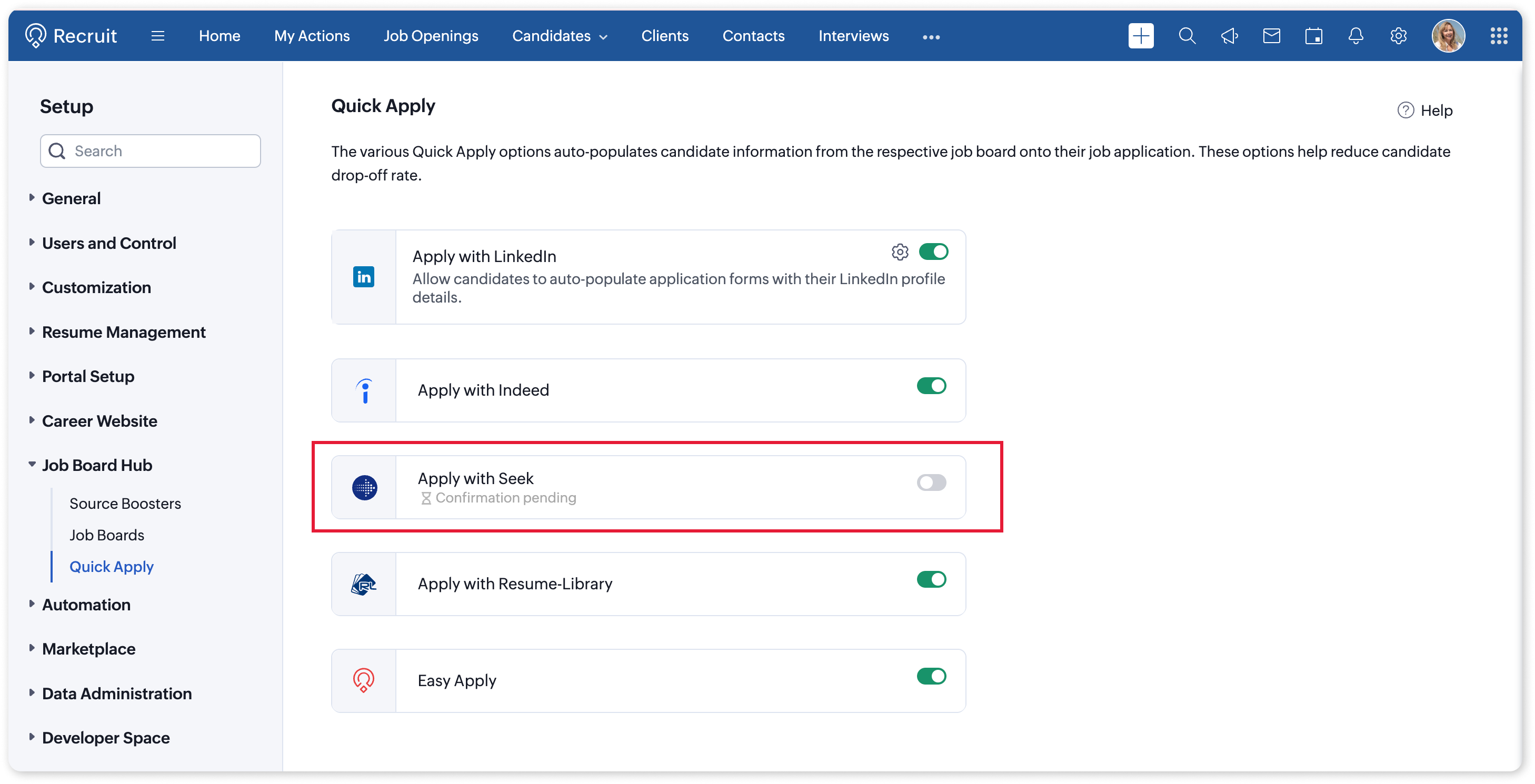- Navigate to Setup > Job Board Hub > Quick Apply.