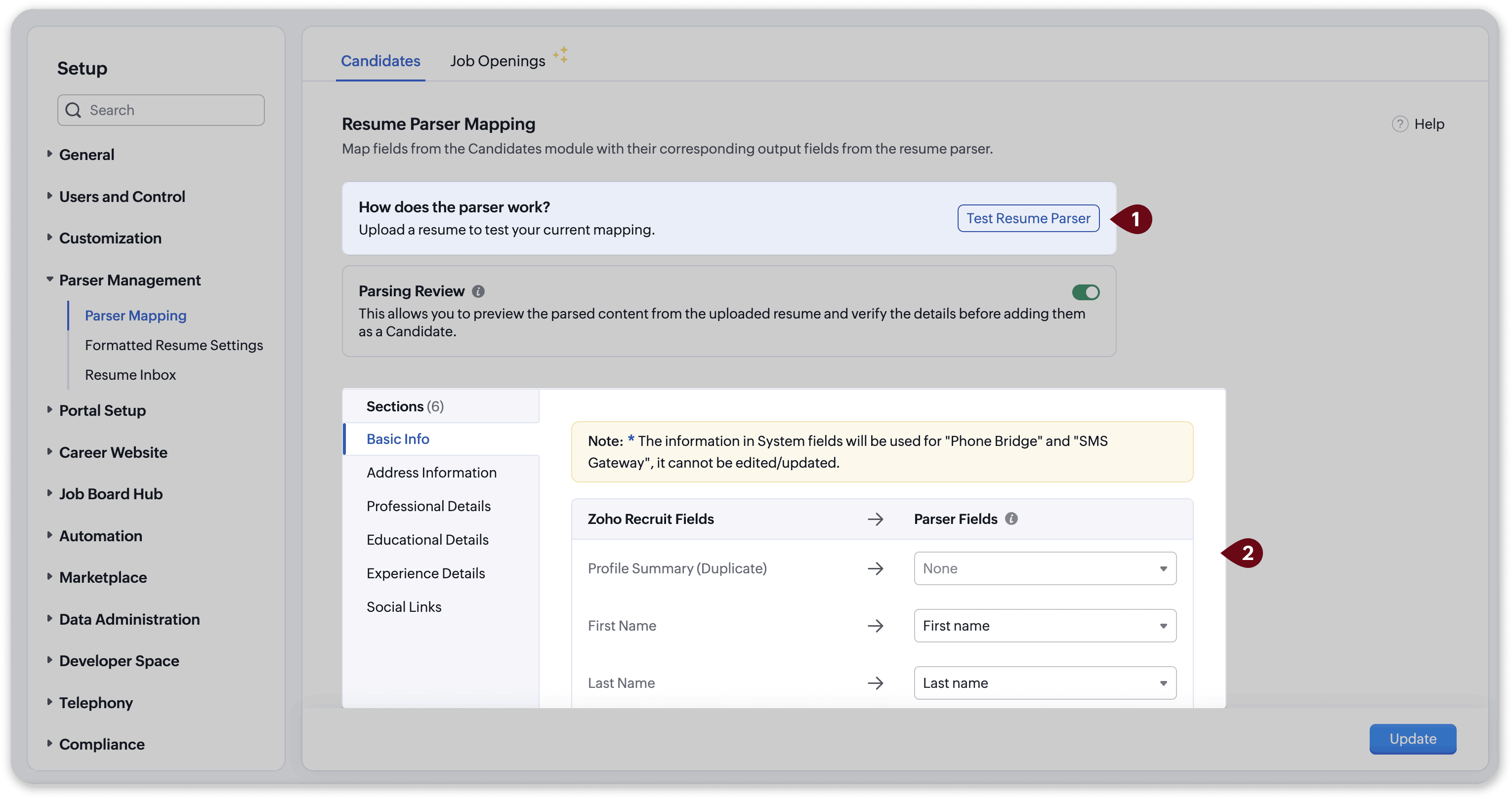 5. You will be redirected to Parser Management > Parser Mapping in the Setup section of your Zoho Recruit account. From here you can manage the mapping and test your current configuration.