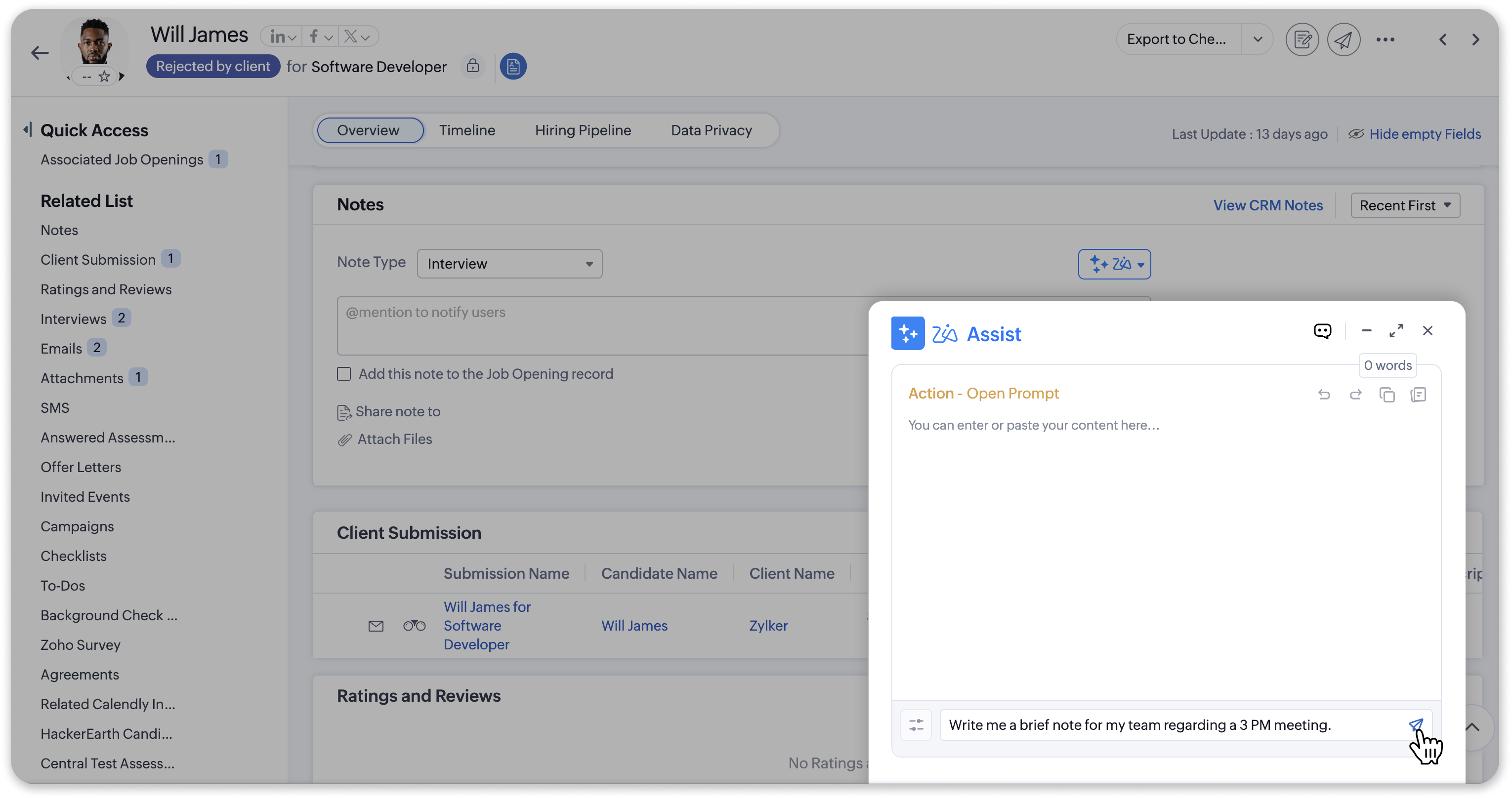 - While in the Send Email page, hover over the Zia Assist button and click Open Prompt.