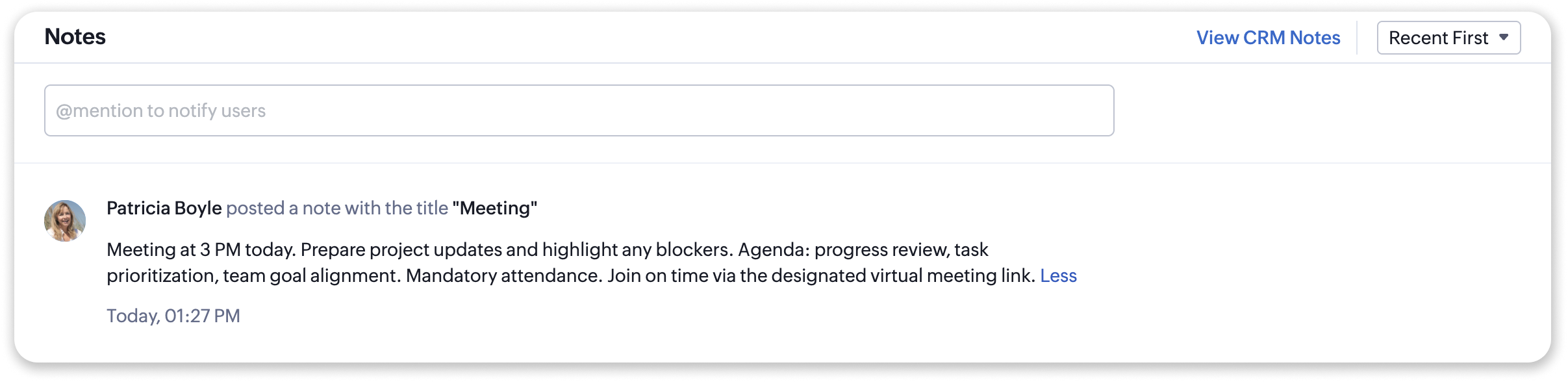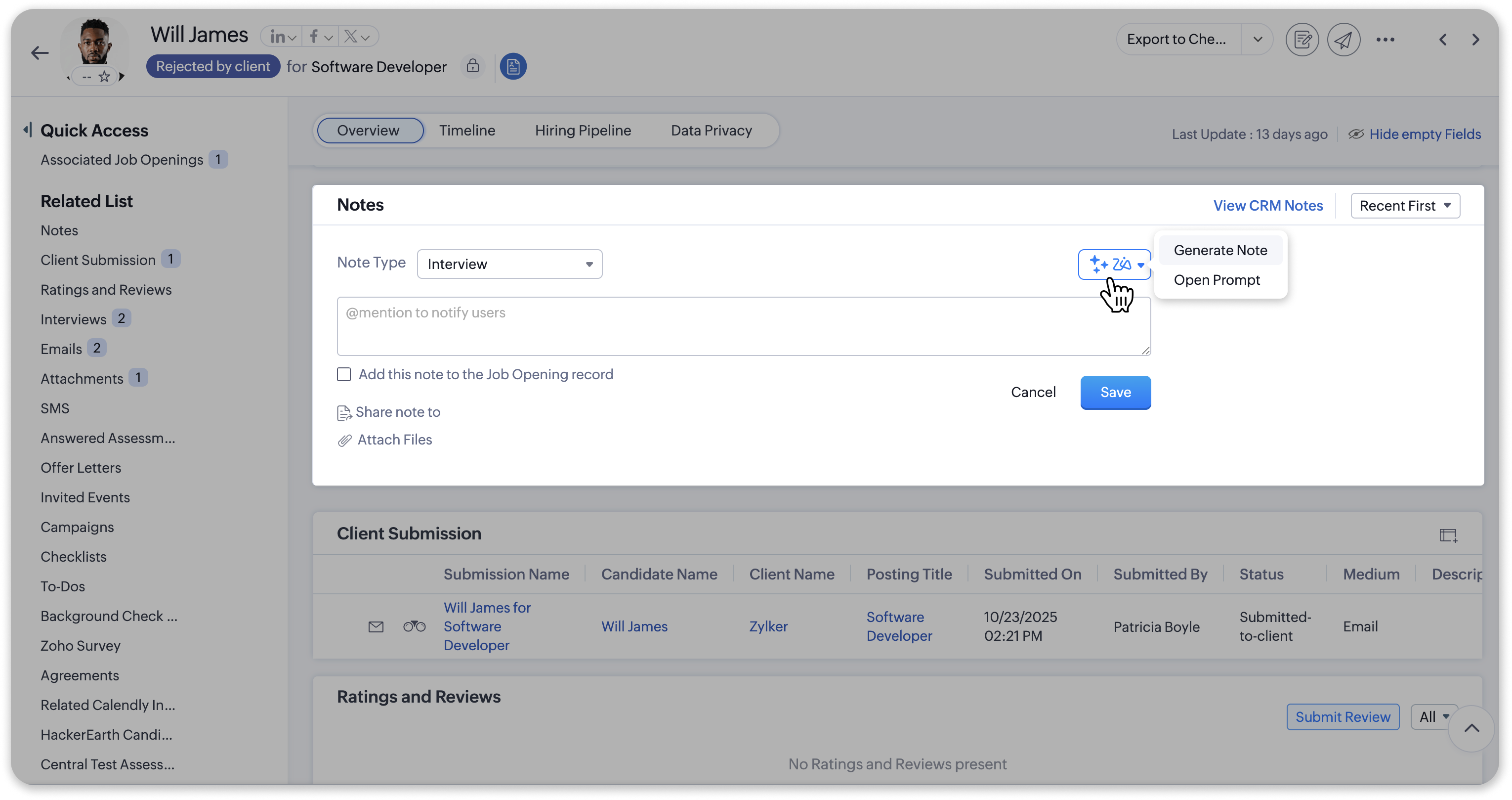 - While adding a note to a record, click the AI Assist icon. In the pop-up that is displayed, click either Generate Note or Open Prompt.