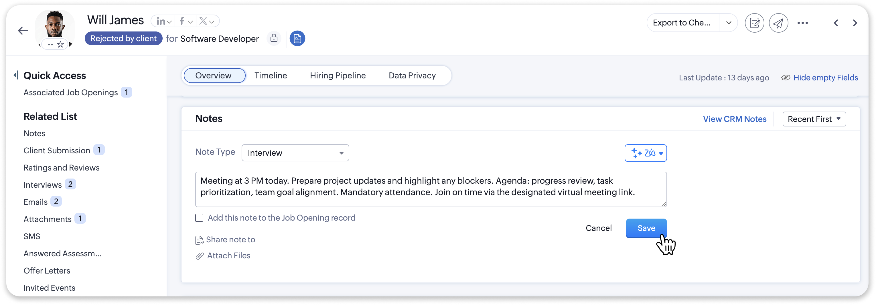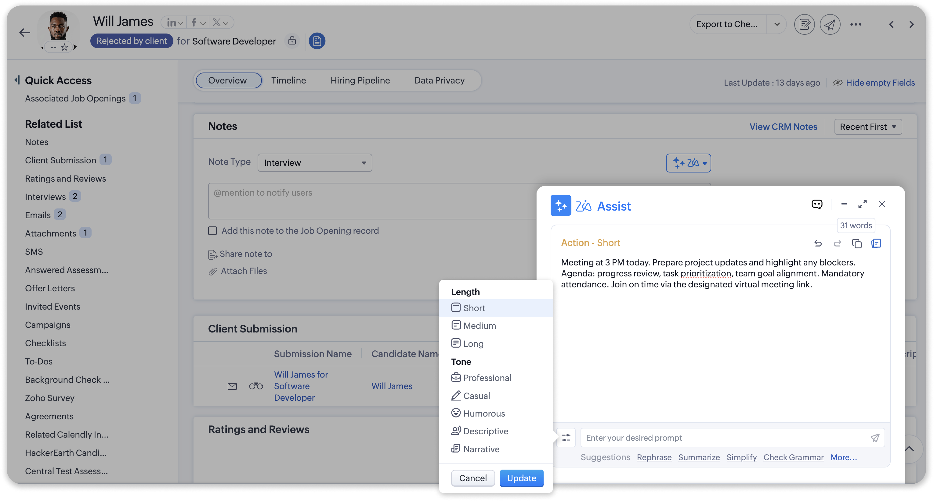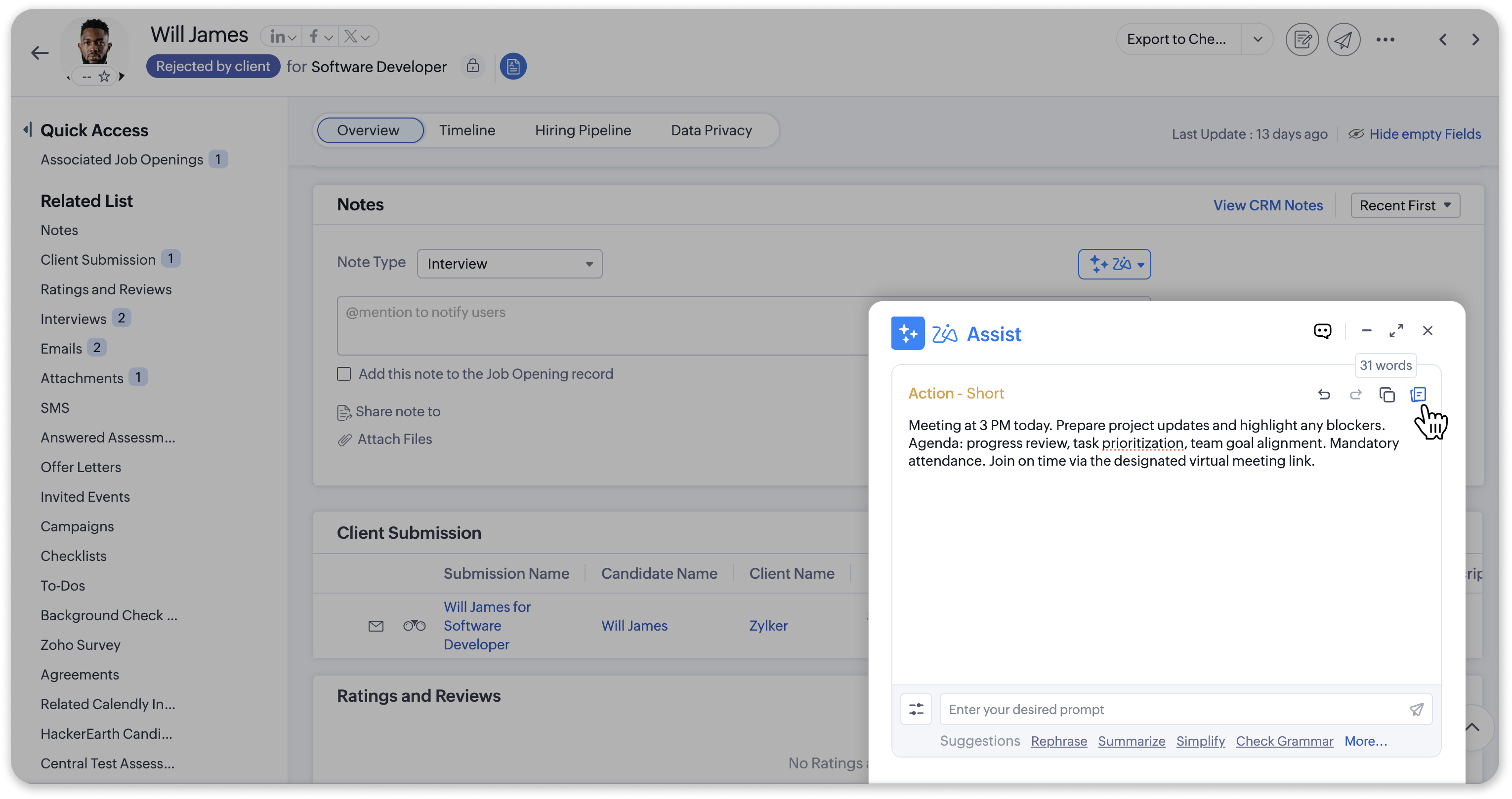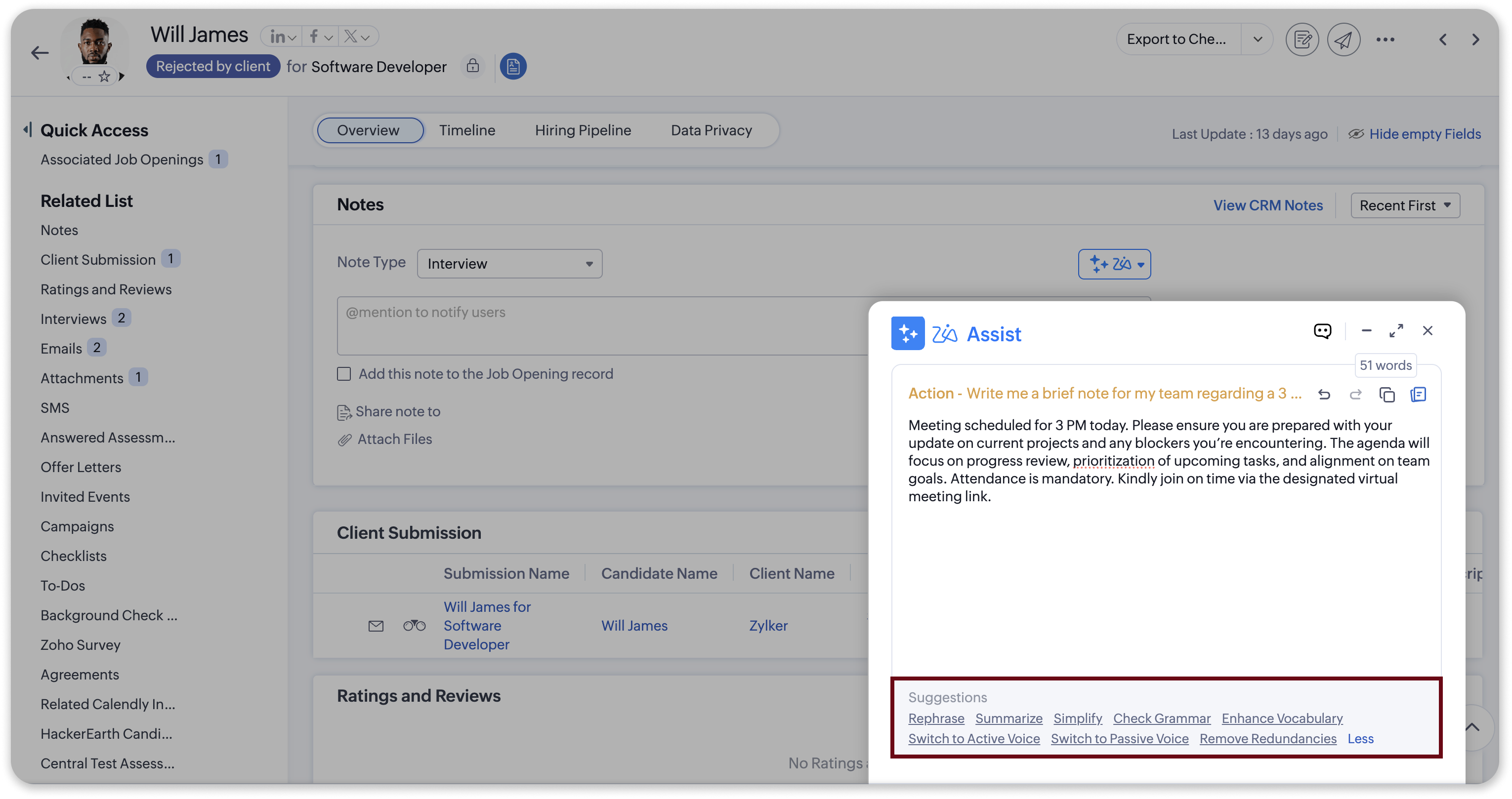 AI Assist revolutionizes recruitment workflows by streamlining content creation across various communication channels within Zoho Recruit. Recruiters can leverage generative AI to draft professional job descriptions, emails, SMS, and messaging templates, ensuring content is relevant, clear, and tailored to each scenario.