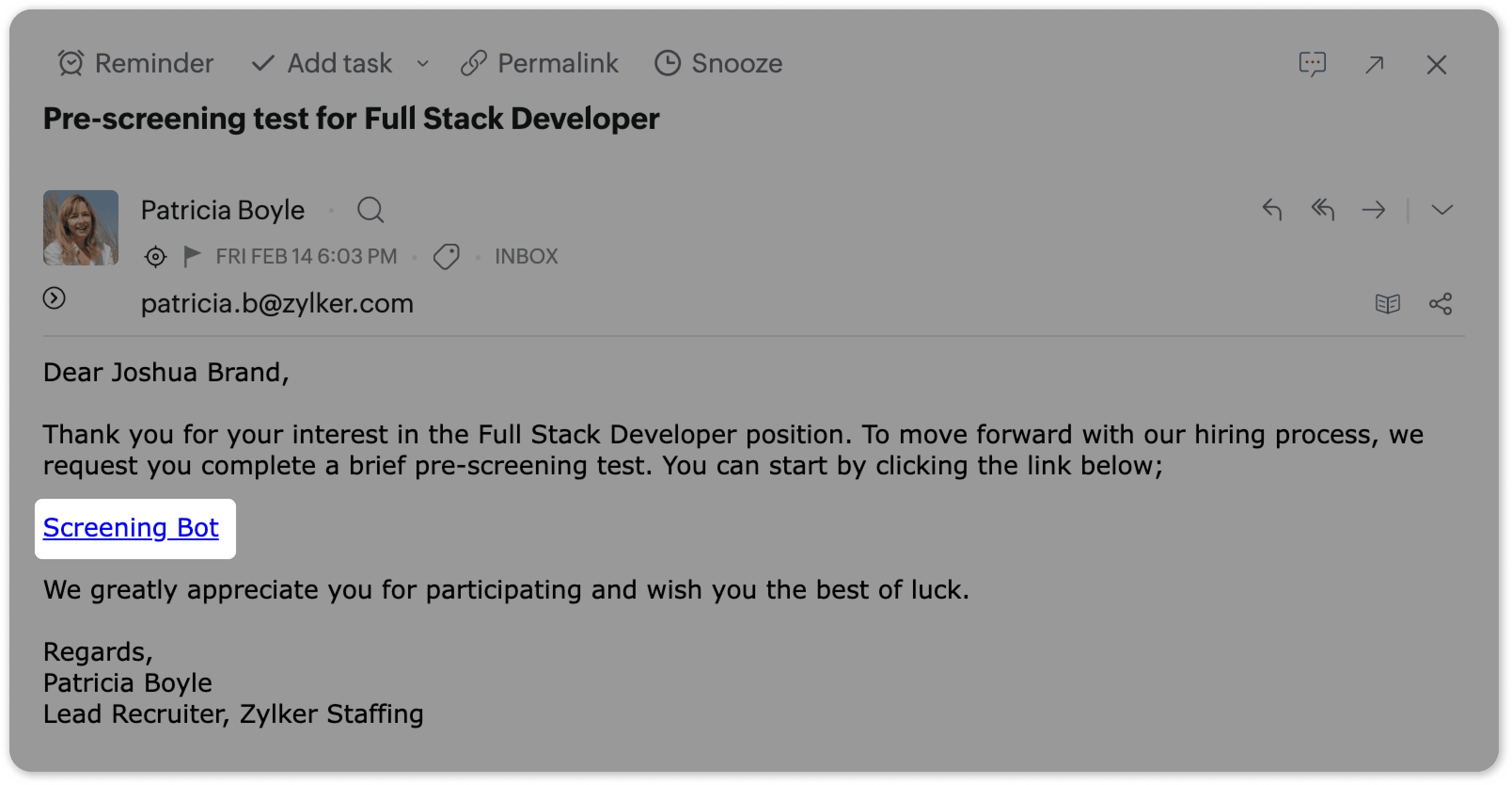 The candidate will then receive the email with the Assessment Bot Link in their inbox.