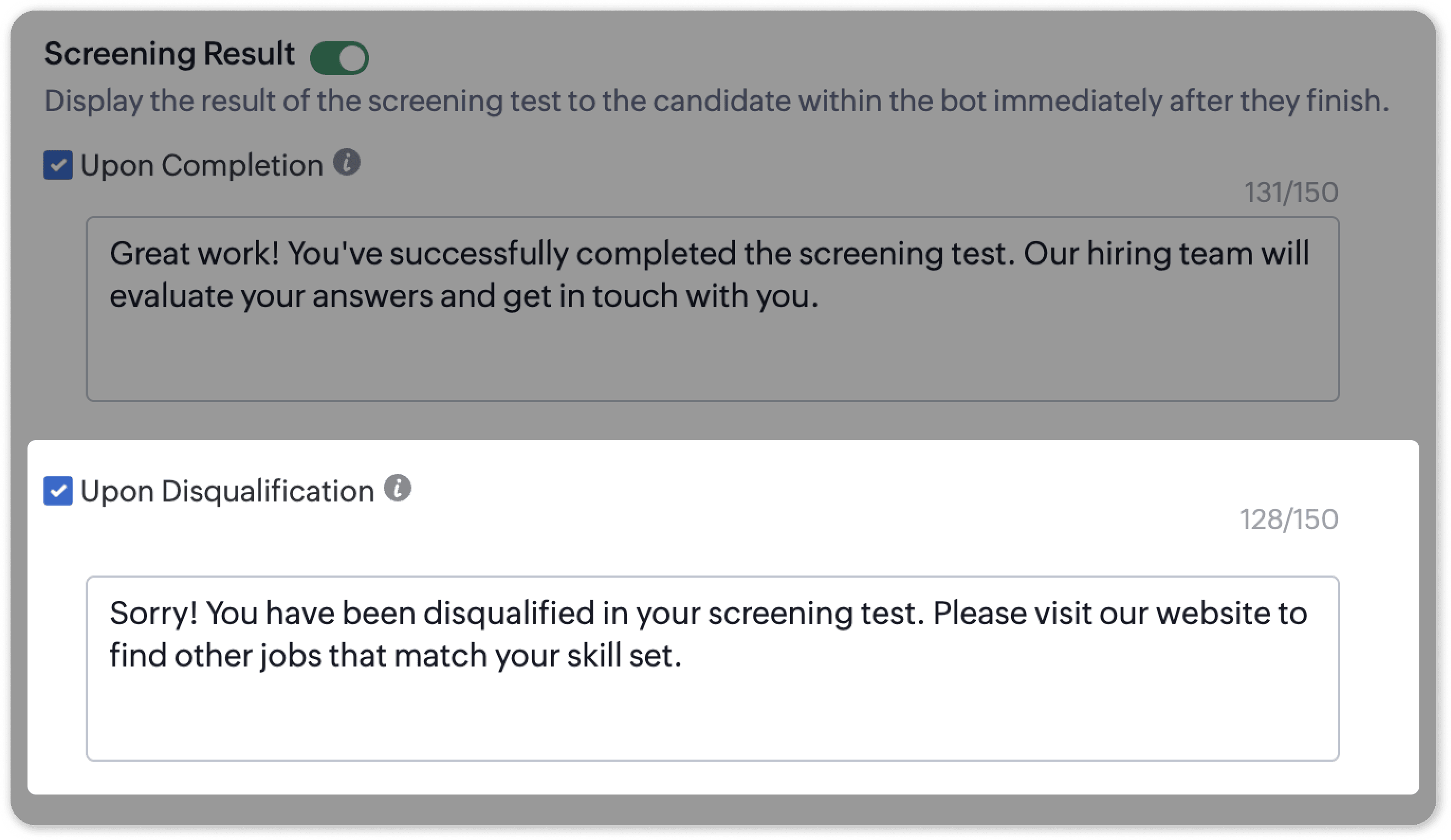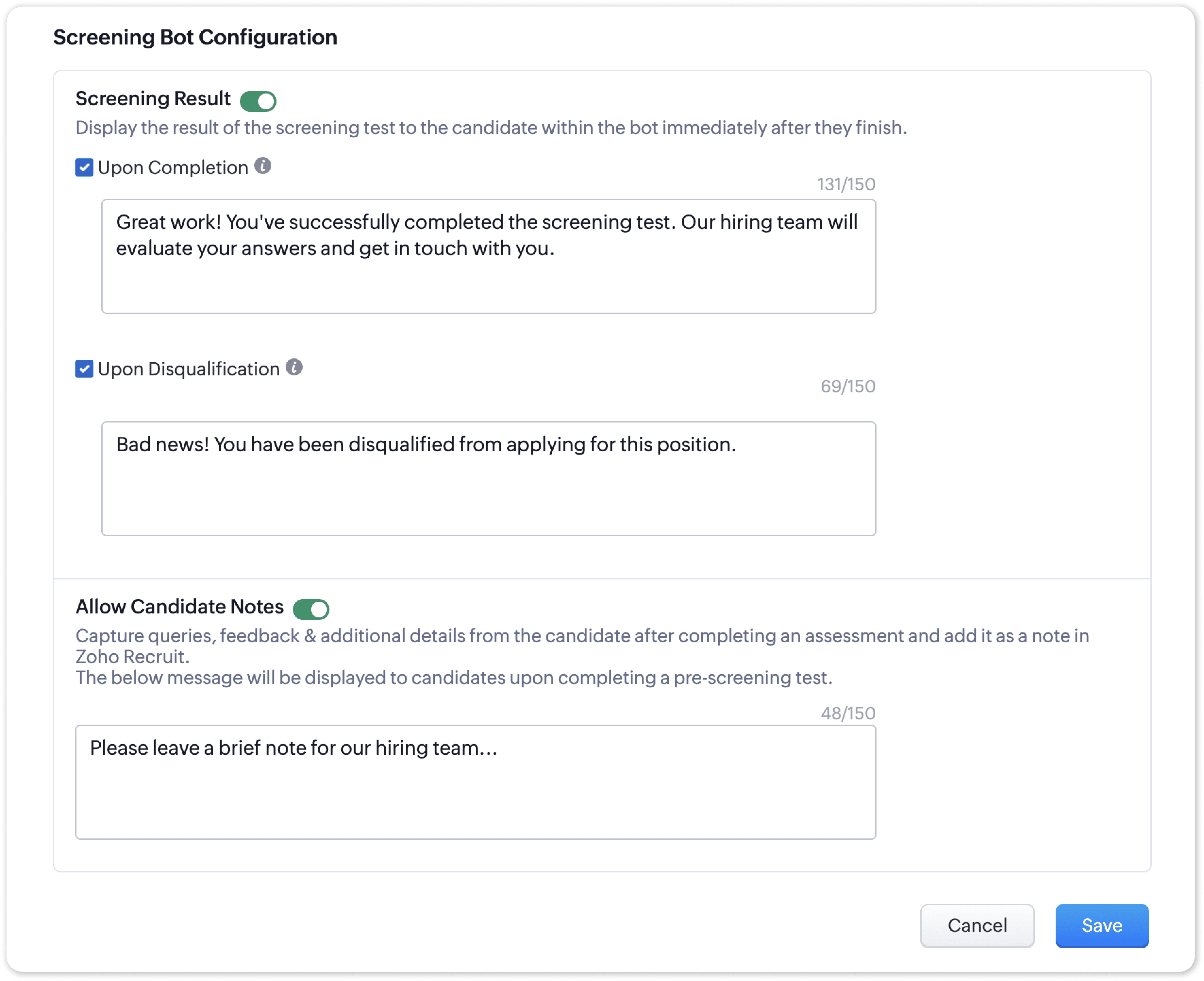 Next up, specify whether you wish to display the Screening Result within the bot and if you wish to Allow Candidate Notes under the Screening Bot Configuration section.Click Save when you are done.