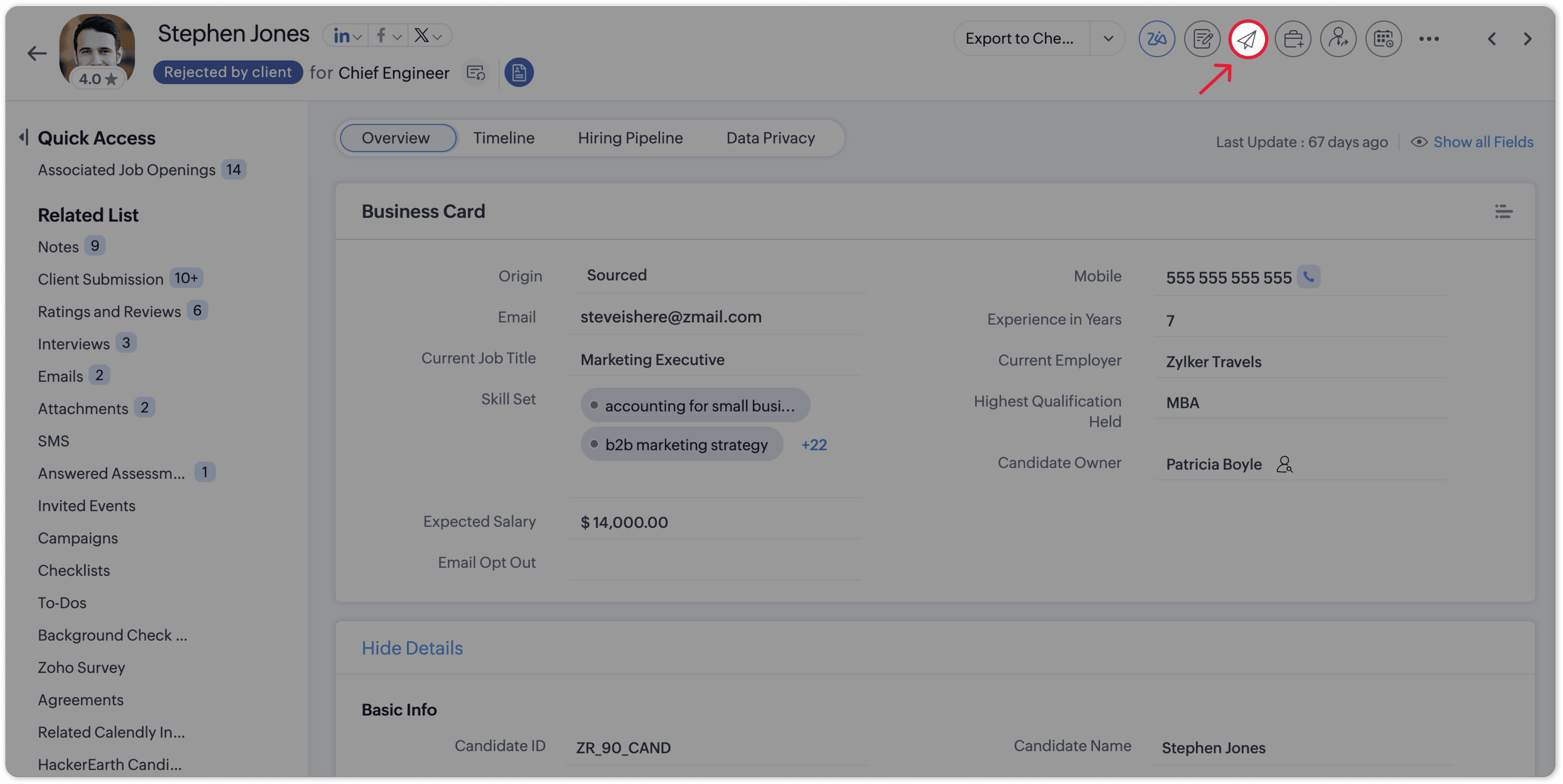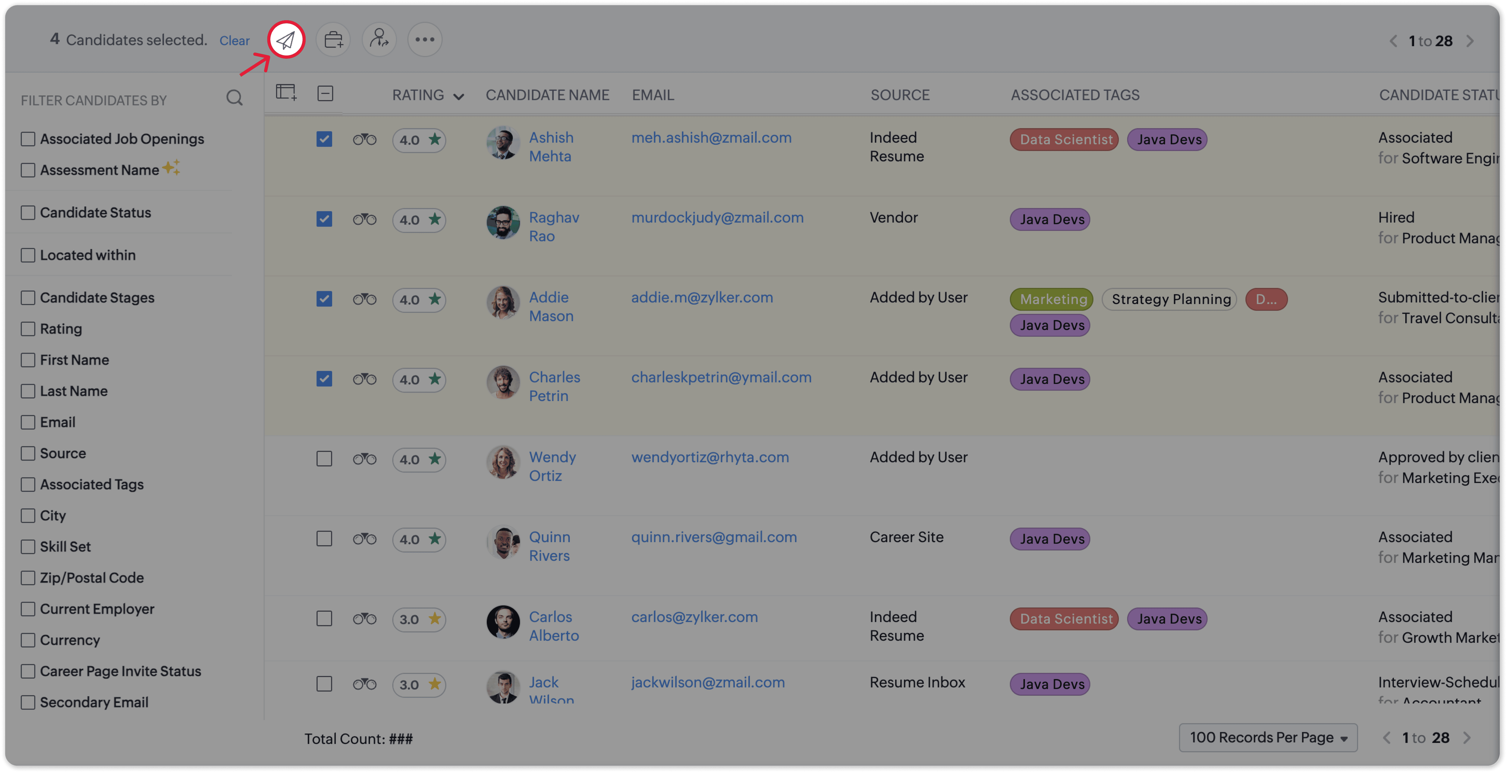 Go to the Candidates module and select the candidate you wish to send the bot assessment to and click the Send Email icon.