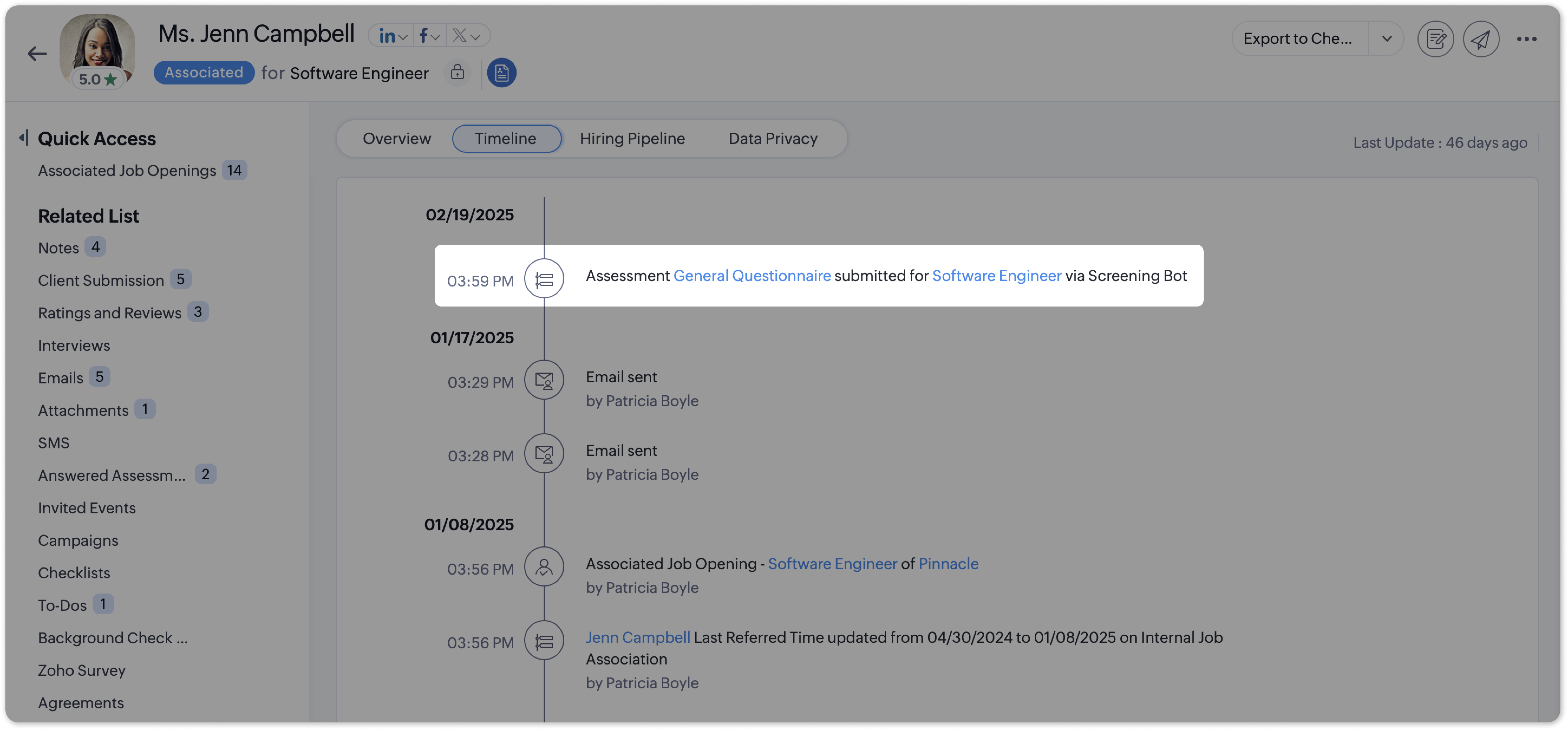 After candidates finish and submit their screening test, their answers will be stored under the Answered Assessments section of their respective records in the Candidates module.