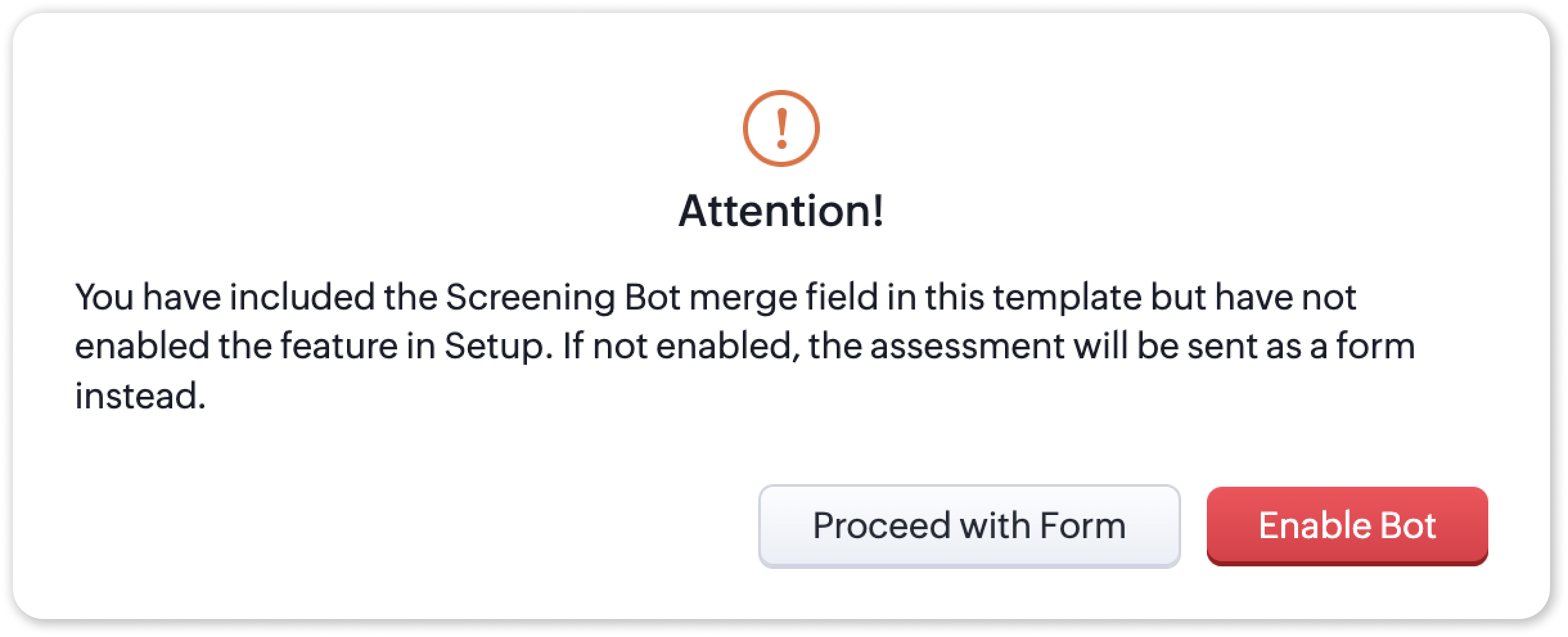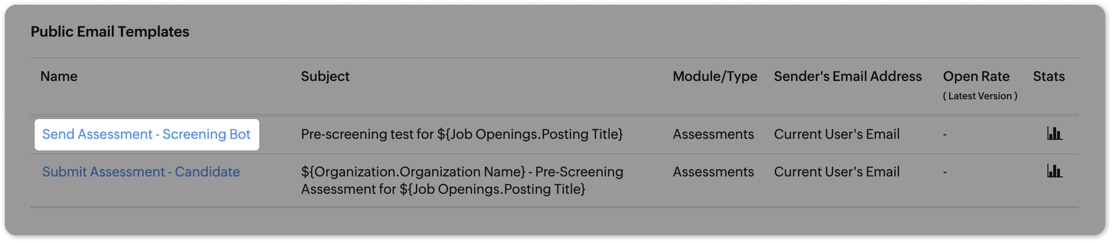 As you may already know, you can send pre-screening assessments to candidates via email in Zoho Recruit (using the Submit Assessment - Candidate email template). Similarly, the screening bot has it own email template named Send Assessment - Screening Bot you can find under Setup > Customization > Templates > Email Templates.