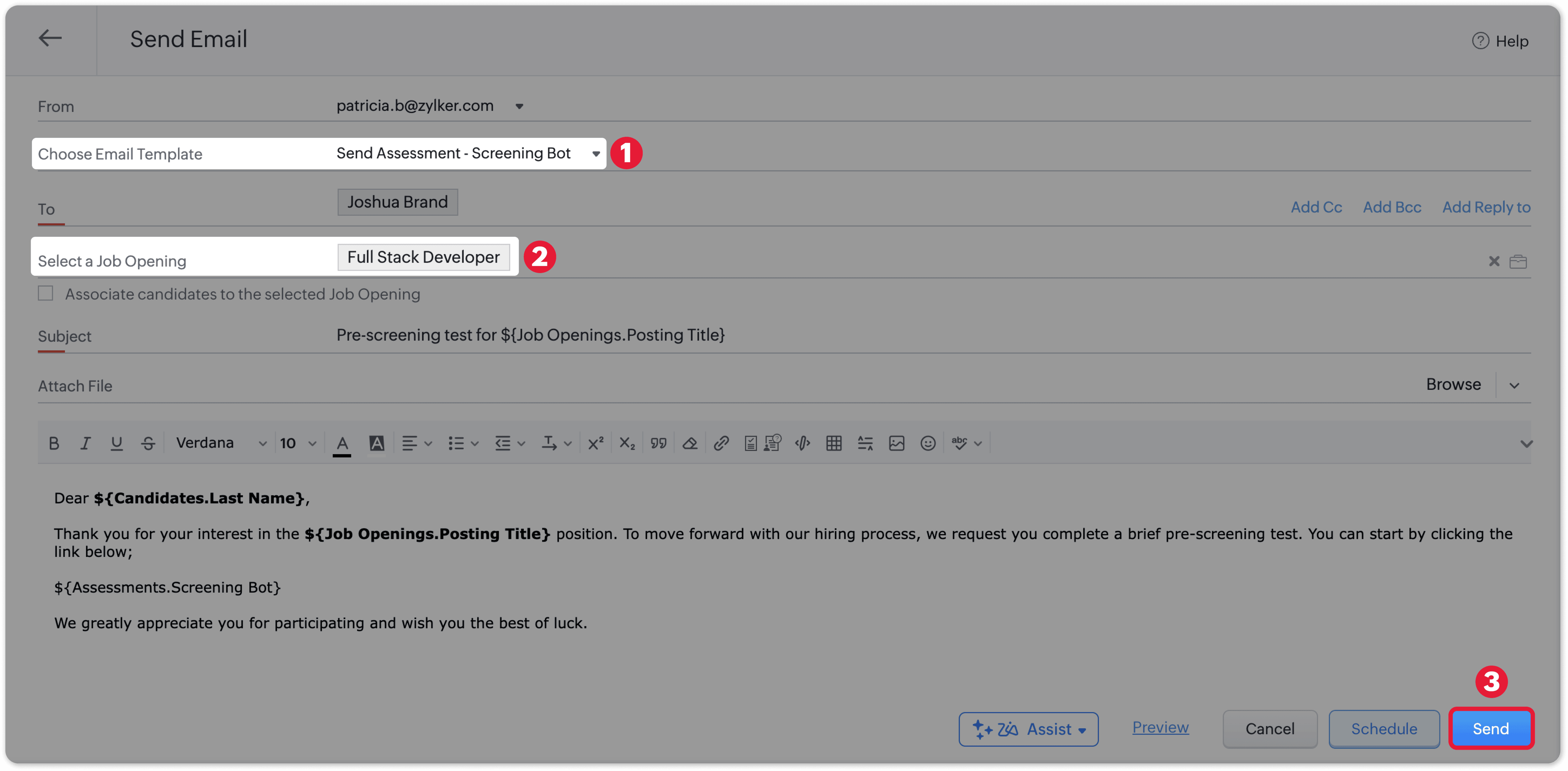 Choose Send Assessment - Screening Bot under Choose Email Template and select which job opening you wish to screen them for under Select a Job Opening. Click Send when you are done.