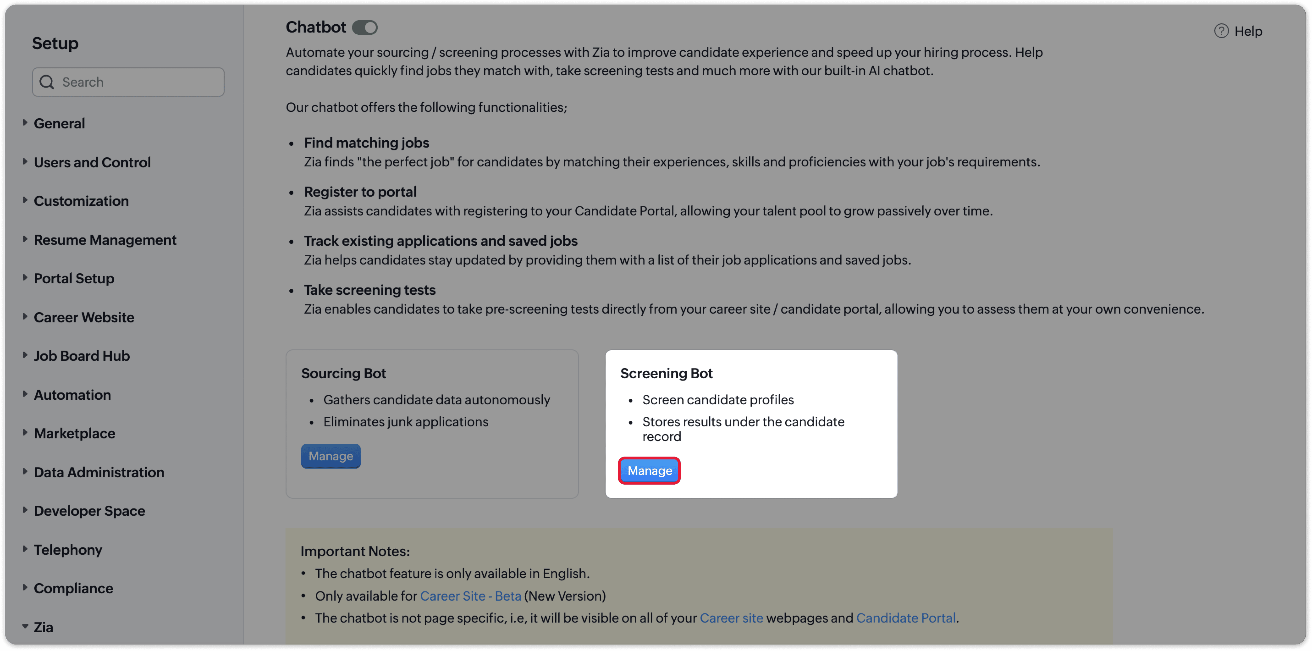 Go to Setup > Zia > Chatbot. Enable the toggle and click Manage under Screening Bot.