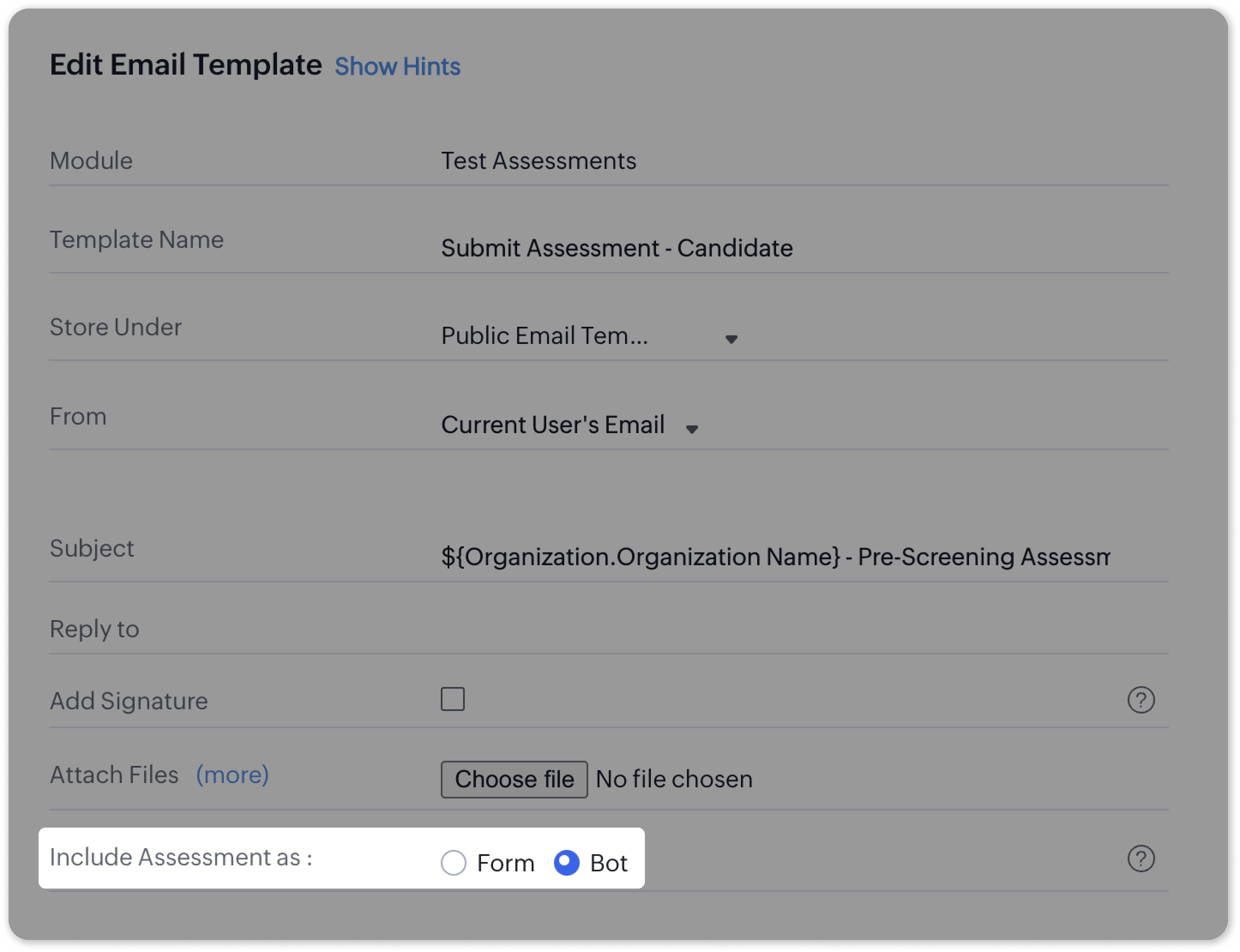 Alternatively, you can also choose to edit the Submit Assessment - Candidate template and include the Bot URL (instead of the Assessment Form). While editing the template, select the Bot option under Include Assessment As.