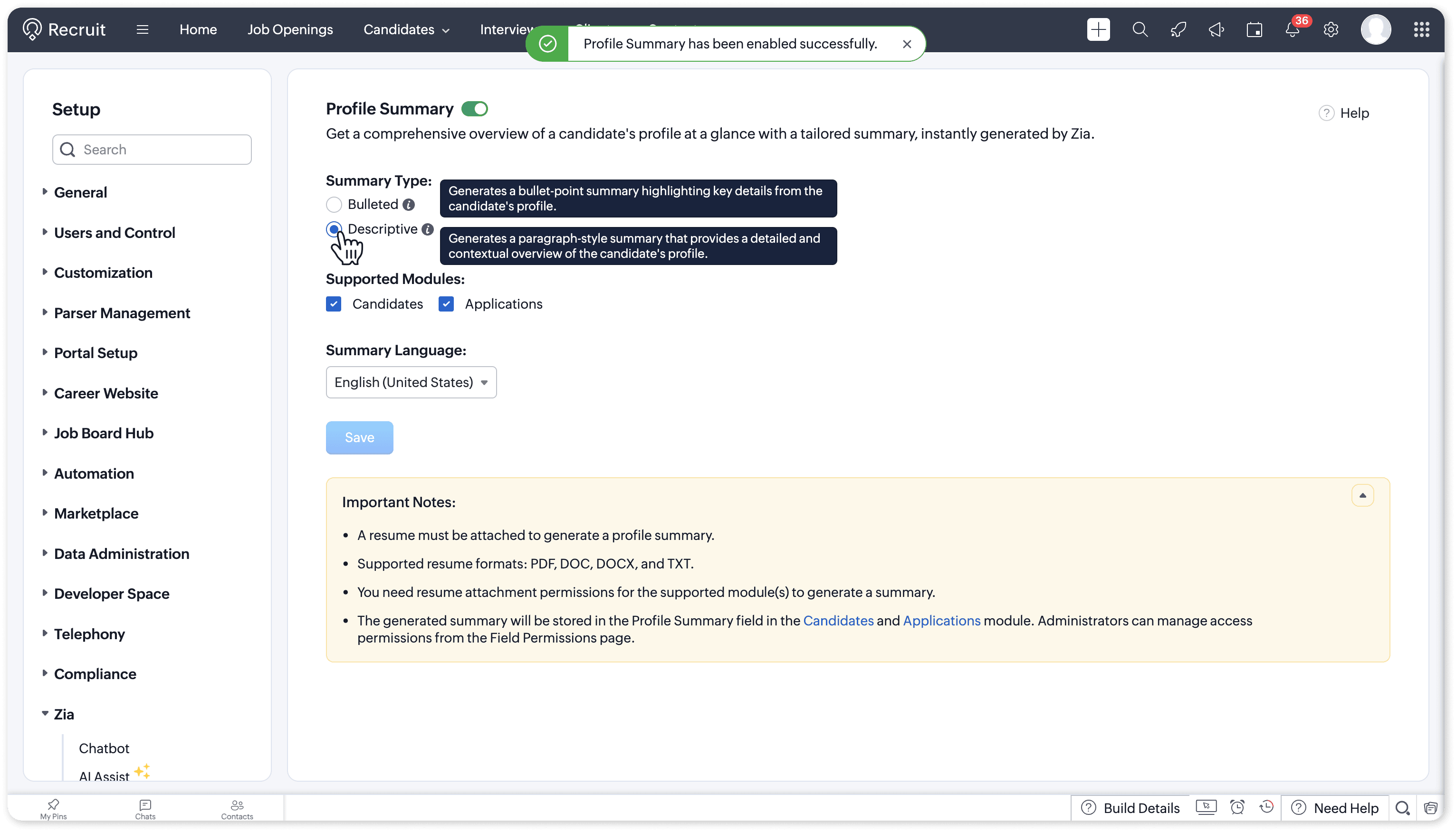 Select the summary type (Bulleted or Descriptive), choose the modules where the summary should be supported, and set the summary language. Finally, click Save.