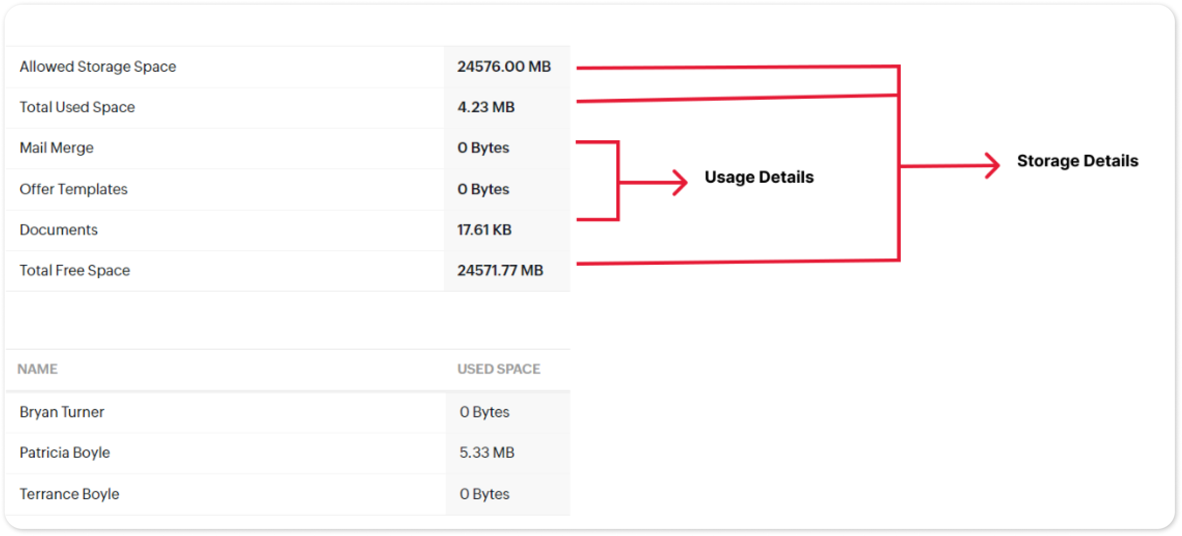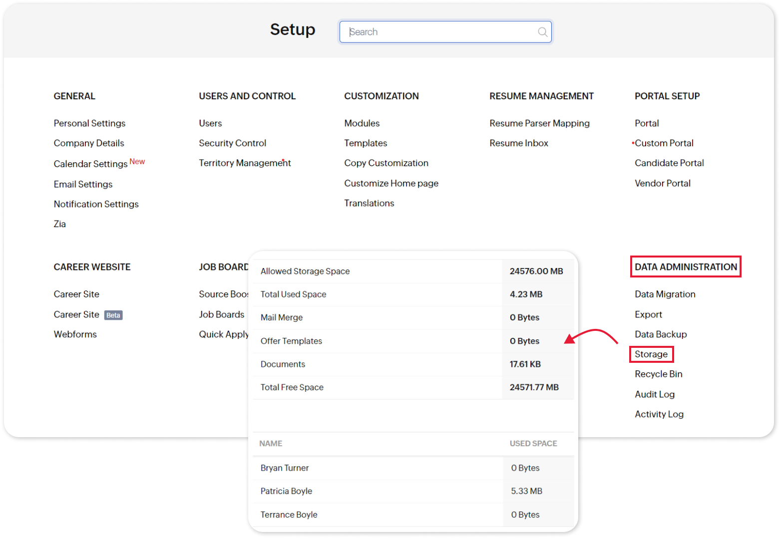 Note: The total amount of used space includes attachments that are in your Recycle bin.The Data Storage in Zoho Recruit is classified into Storage and Usage details.