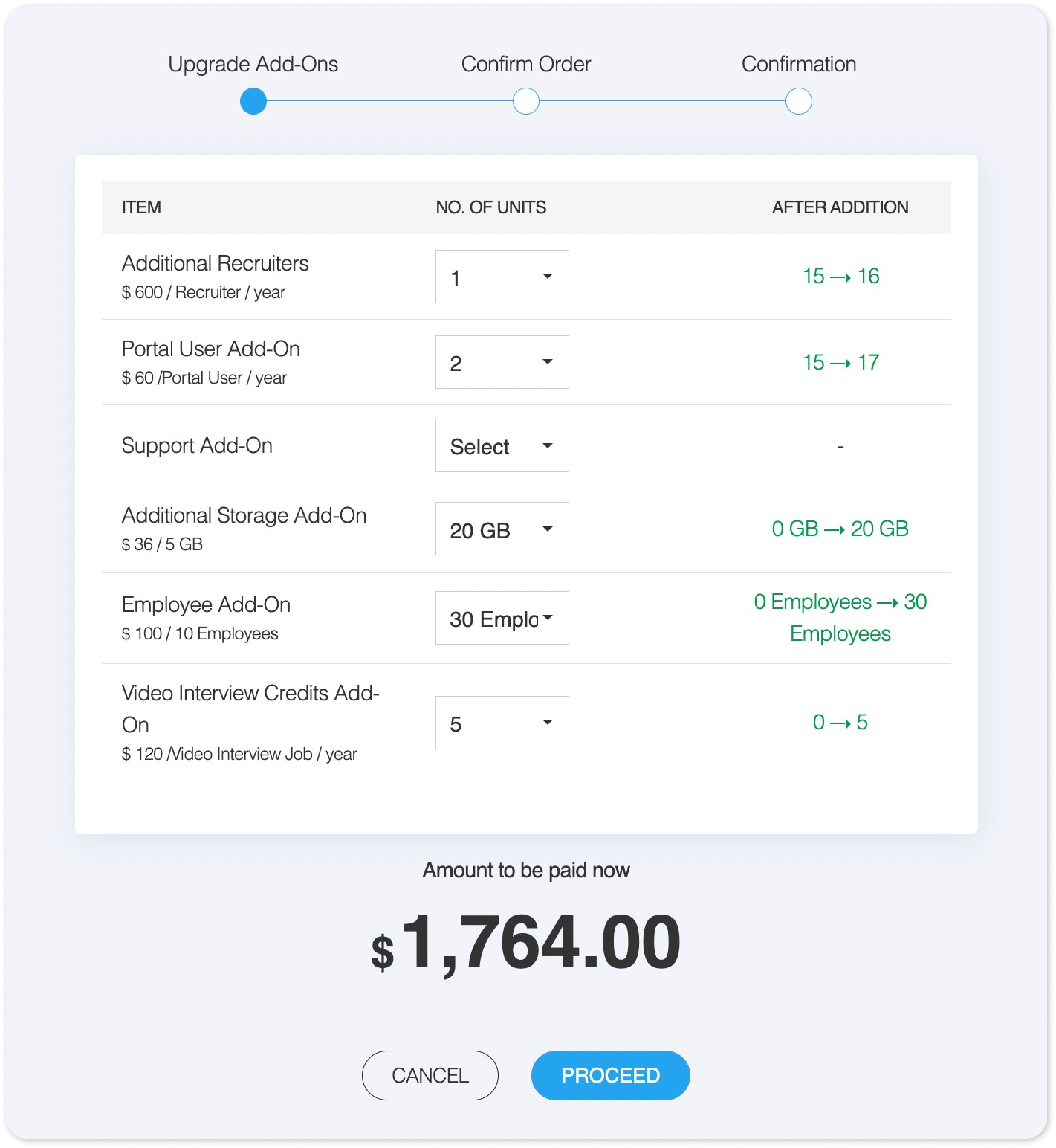 - Manage your Zoho Recruit subscriptions and confirm your subscription order.