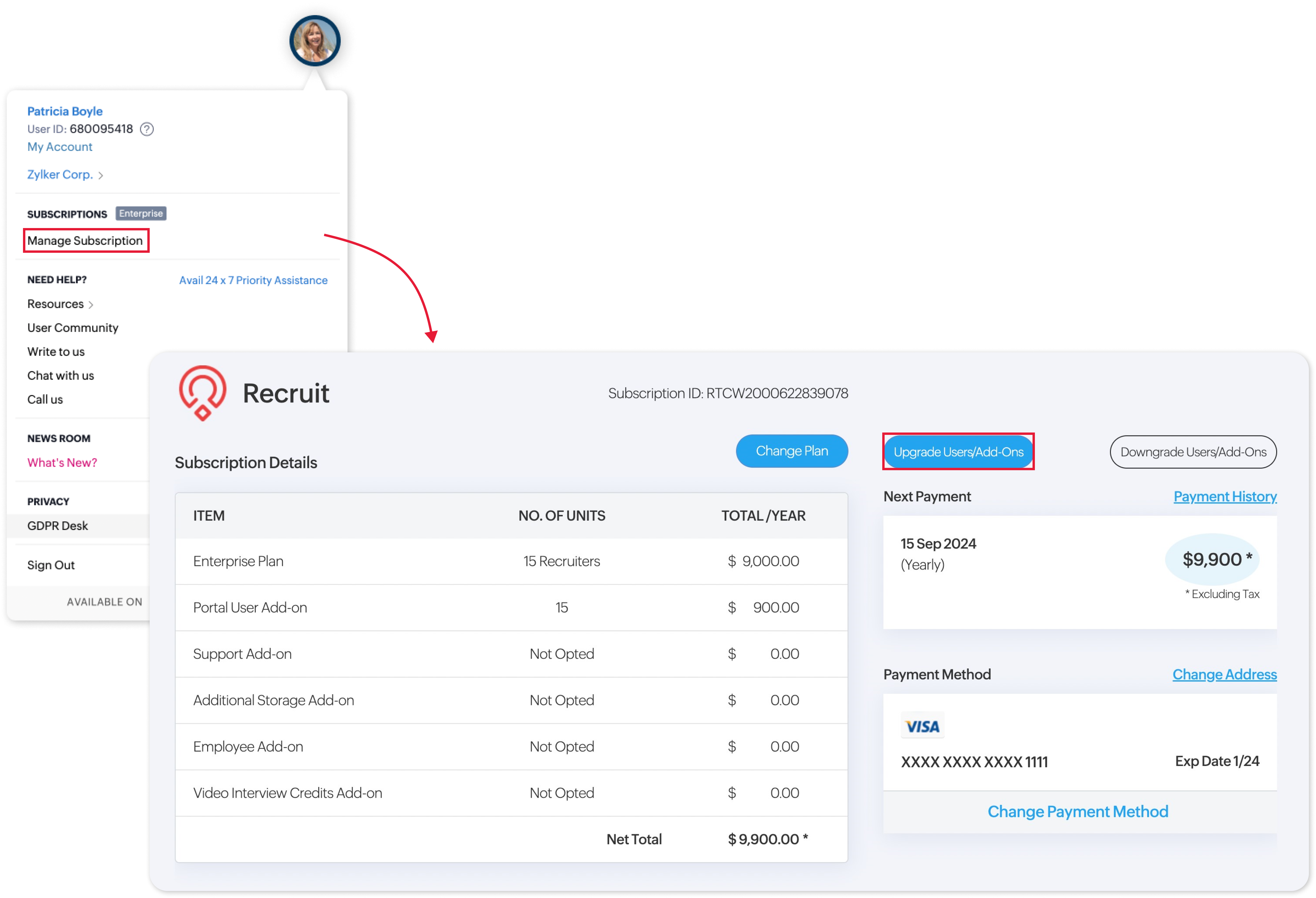 - Go to Profile > Manage Subscription and click Upgrade Recruiter/Add-Ons.