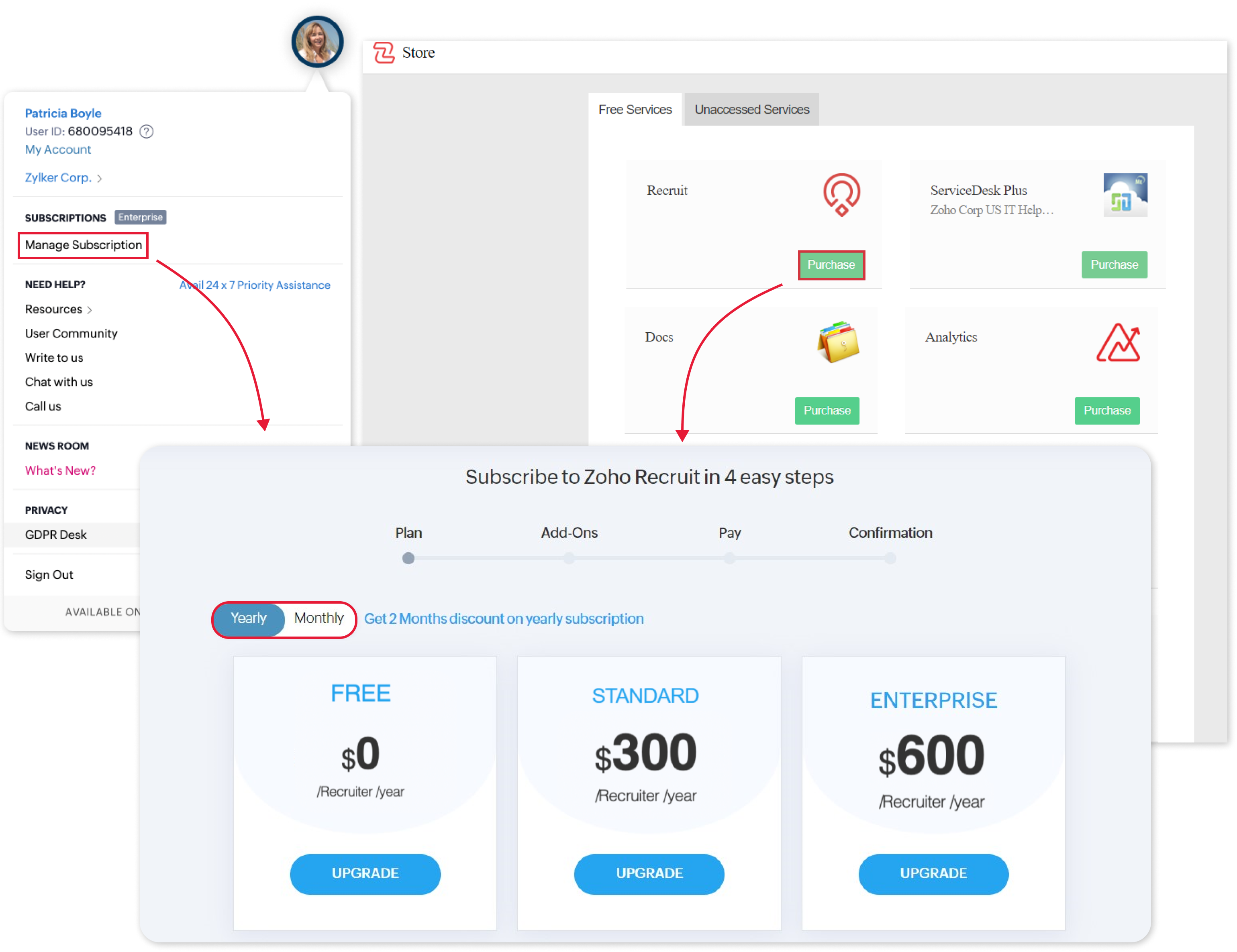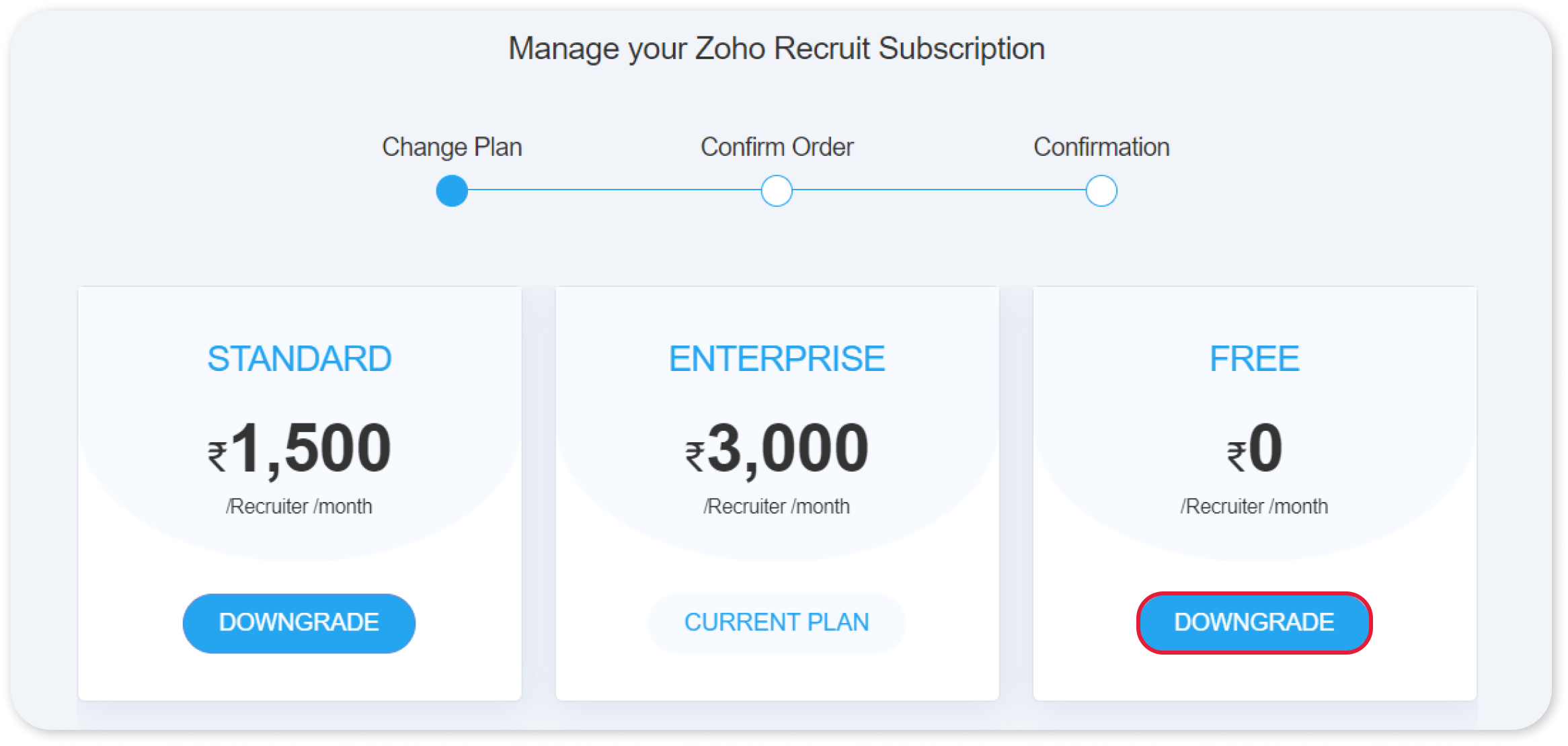 - On successful payment, your Zoho Recruit account will be upgraded to the selected plan.