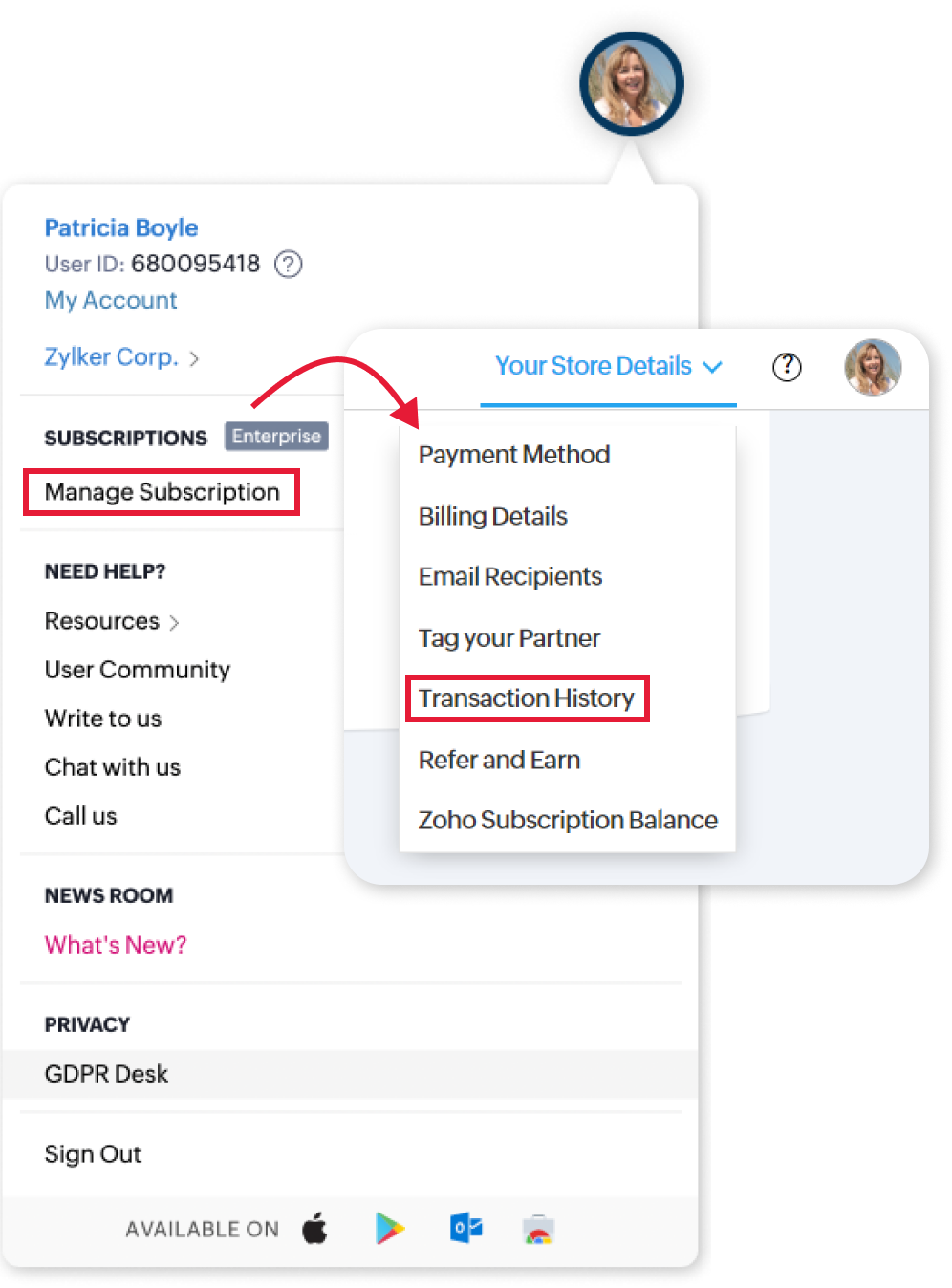 You can view all your previous transactions in your Zoho Recruit account. This includes the date, amount, and transaction ID for each transaction.