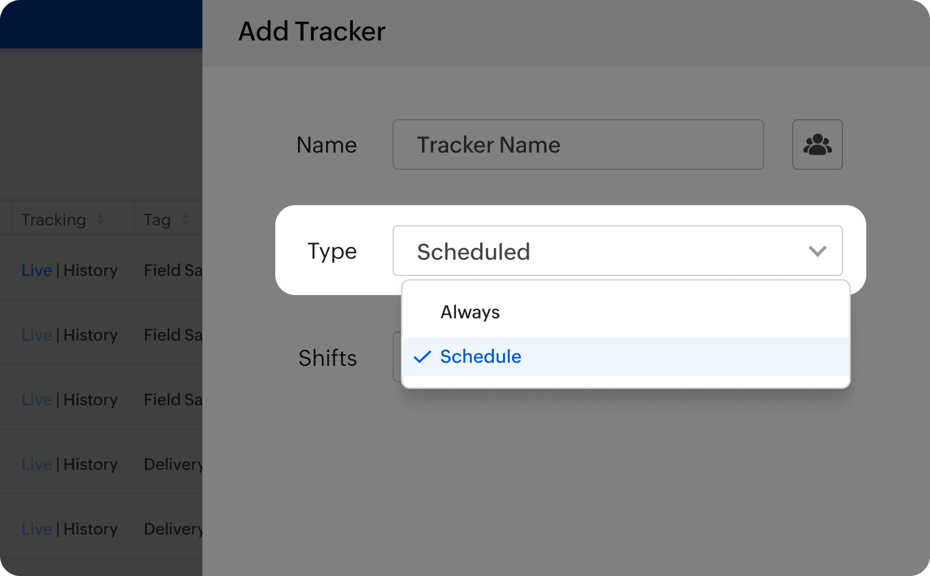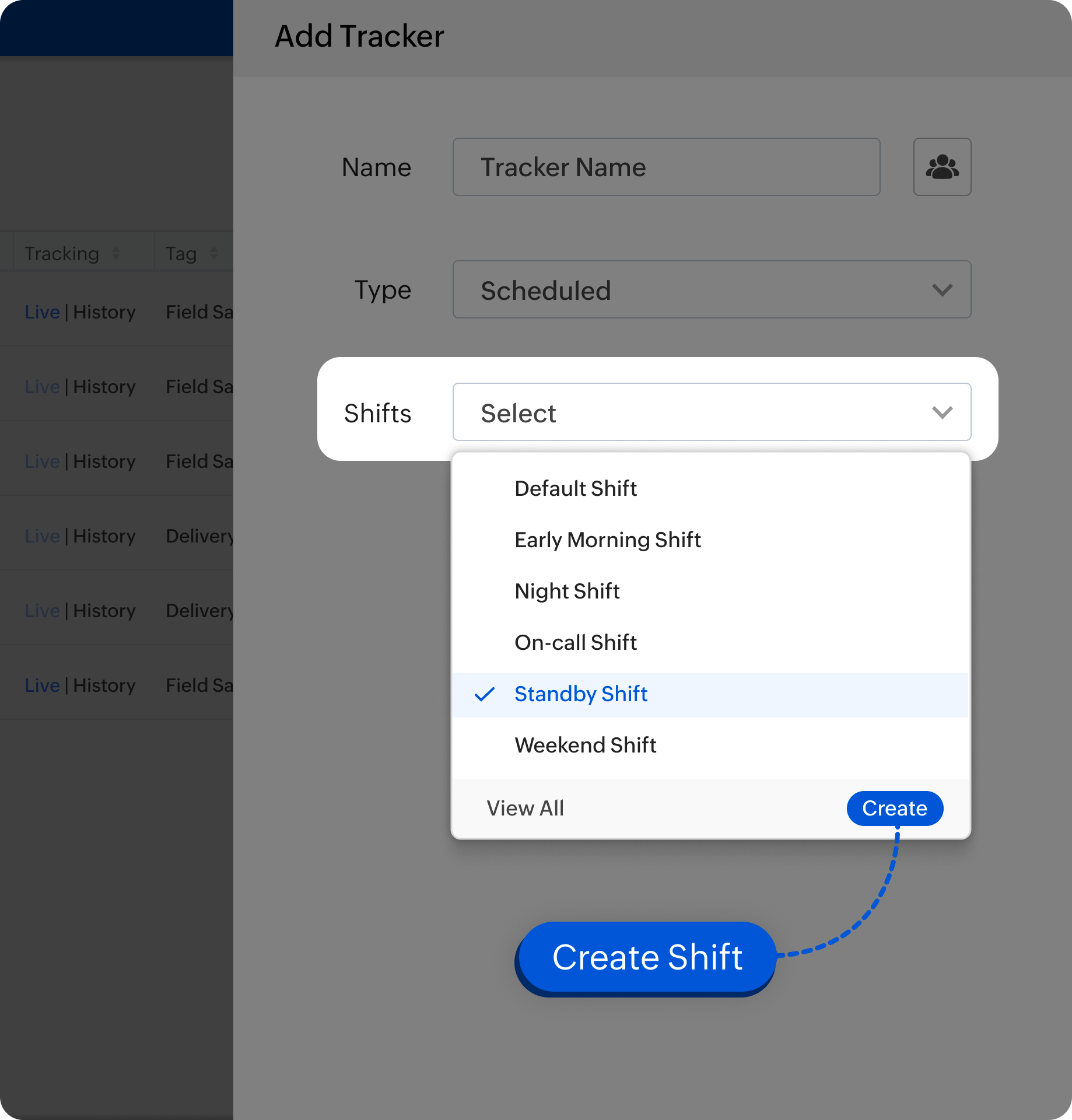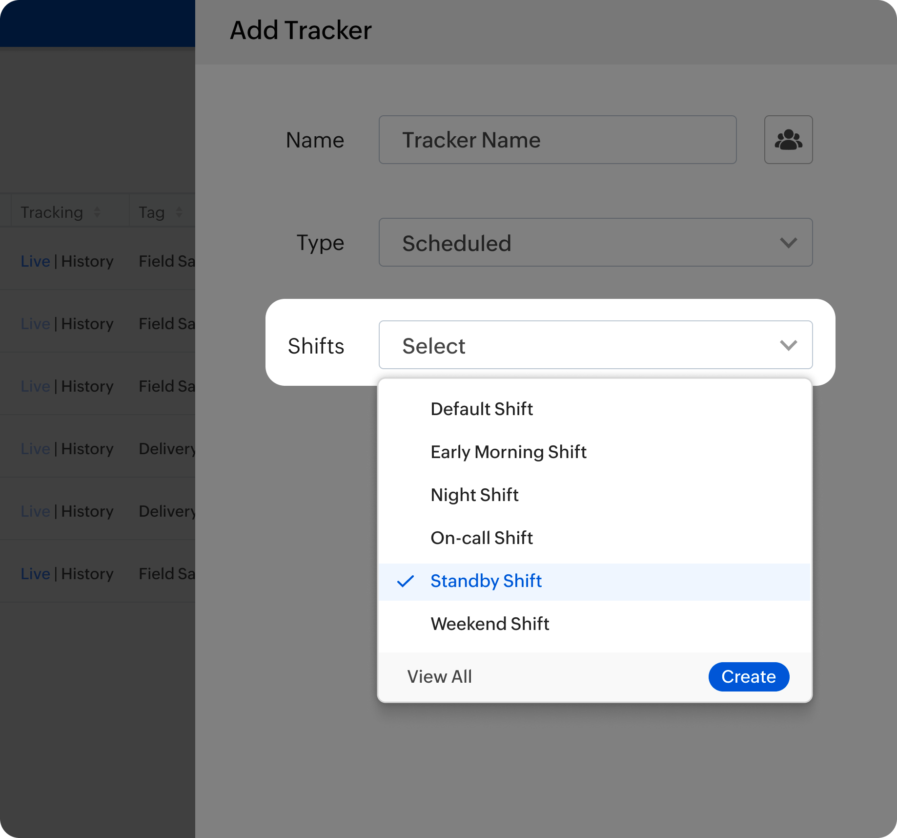 For scheduled tracking type, select a shift hours from the dropdown or create a new shift.