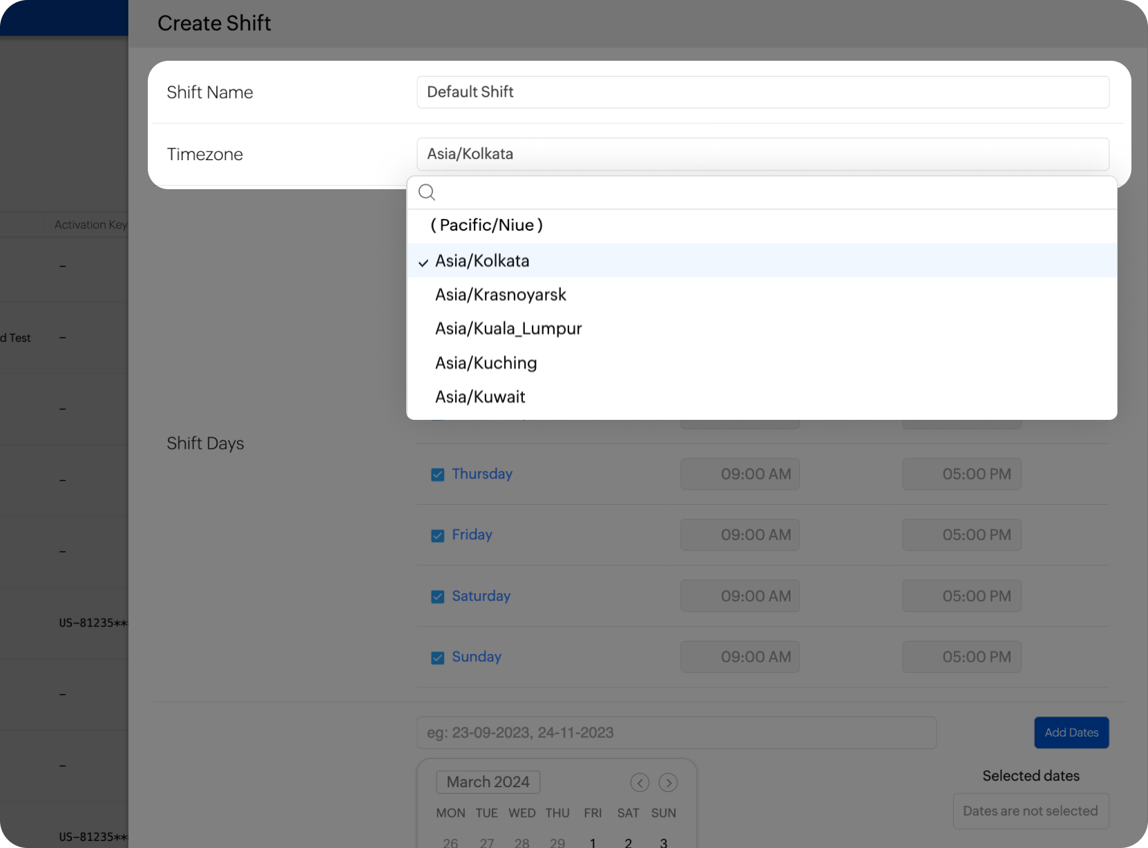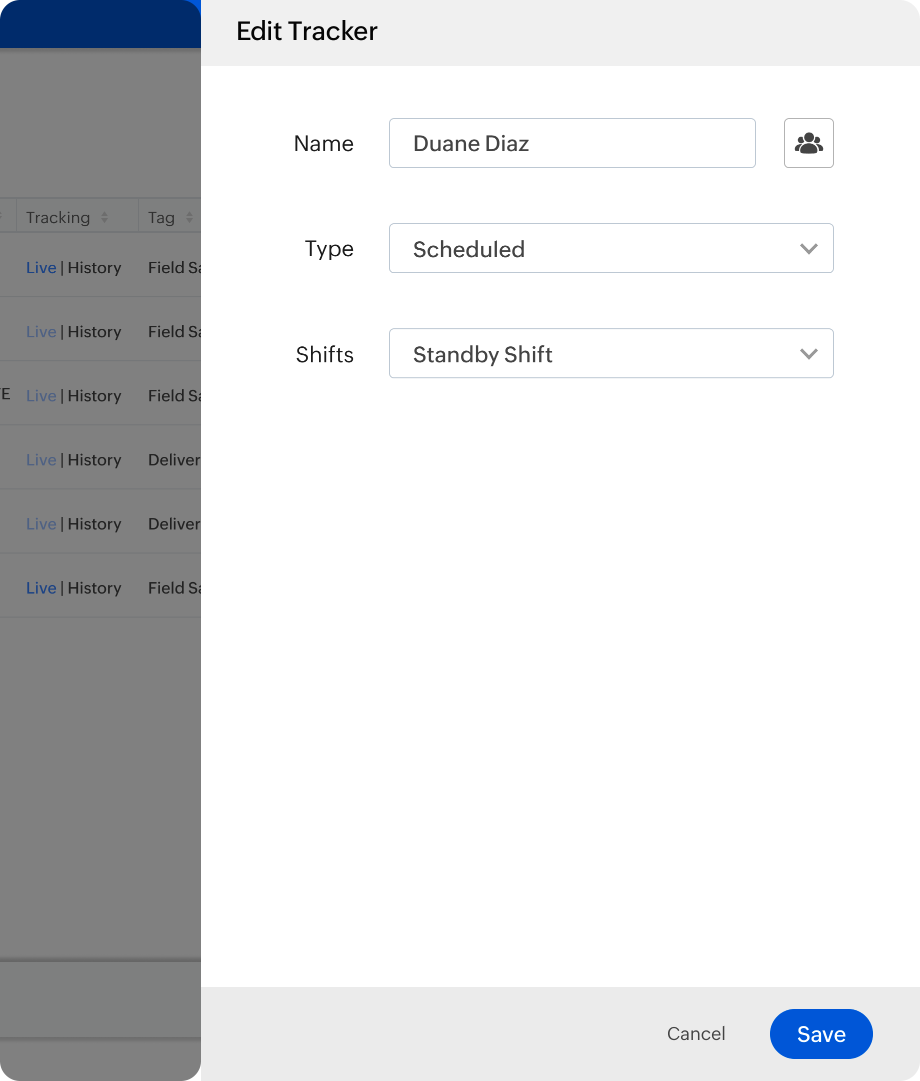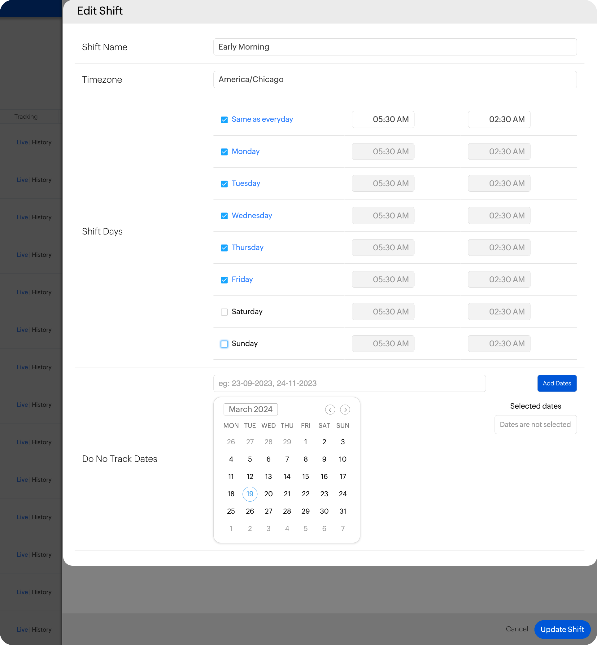 For scheduled tracking type, select a shift hours from the dropdown or create a new shift.
