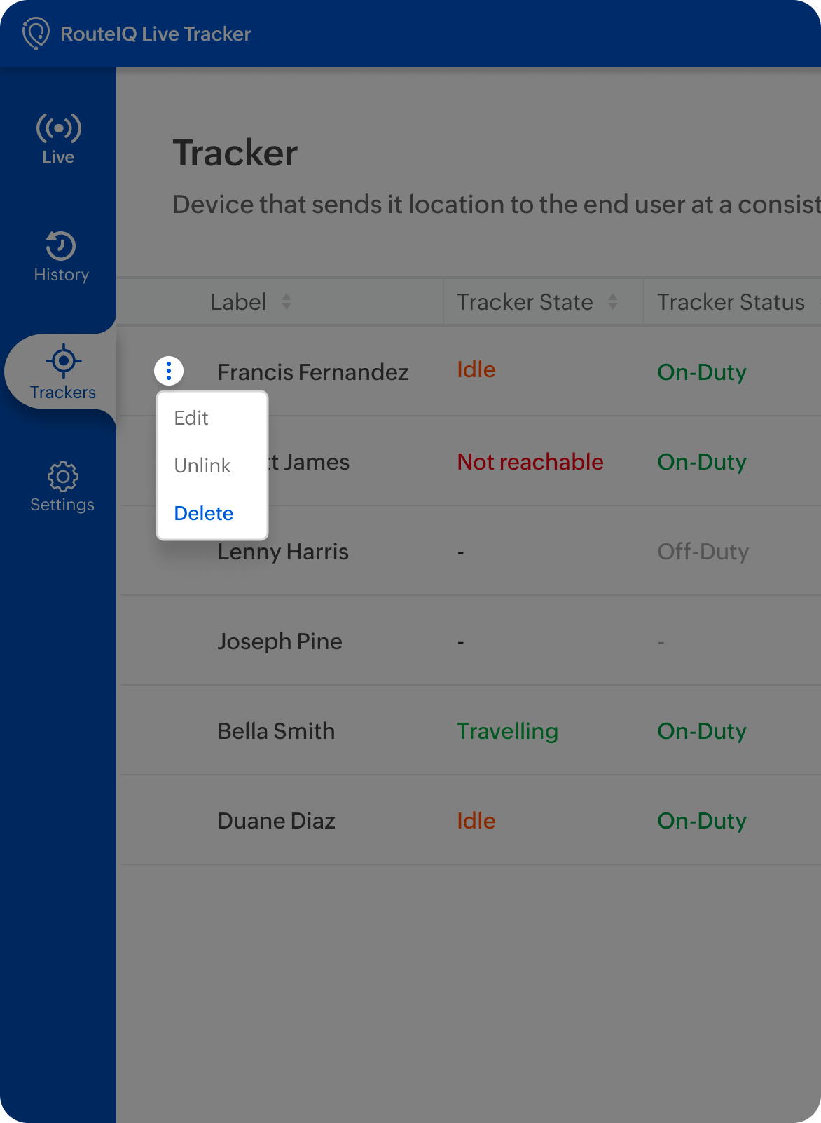 Unlinking a tracker deactivates the tracker RIQ LT Agent mobile app in the field agent or fleet operator's mobile phone and stops RouteIQ Live Tracker from tracking their location.