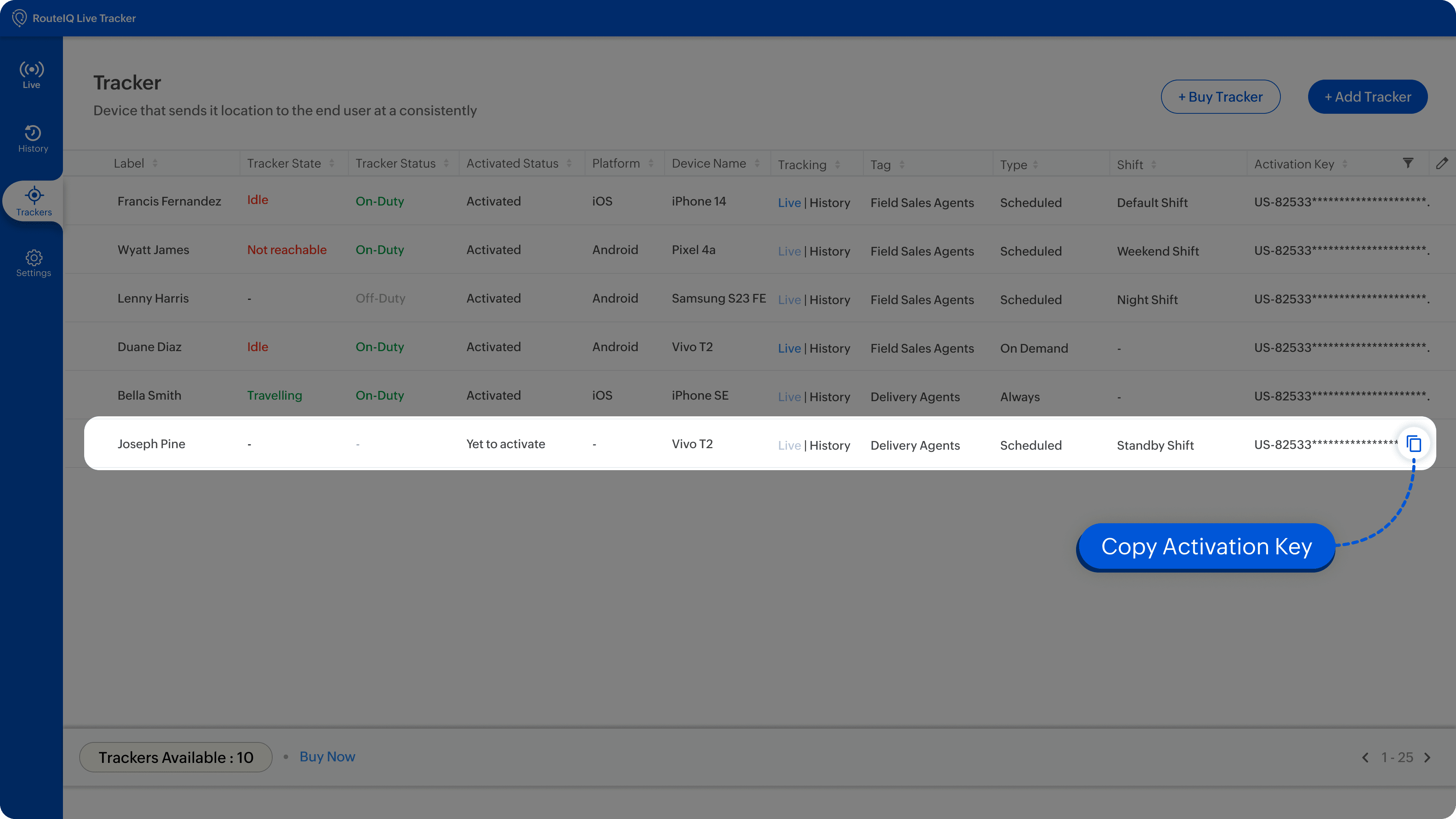 Once the Tracker is added, the Activation Key needs to shared to the field agent or fleet operator, who then needs to activate the tracker by enter the key. Learn more about activating RIQ LT Agent.