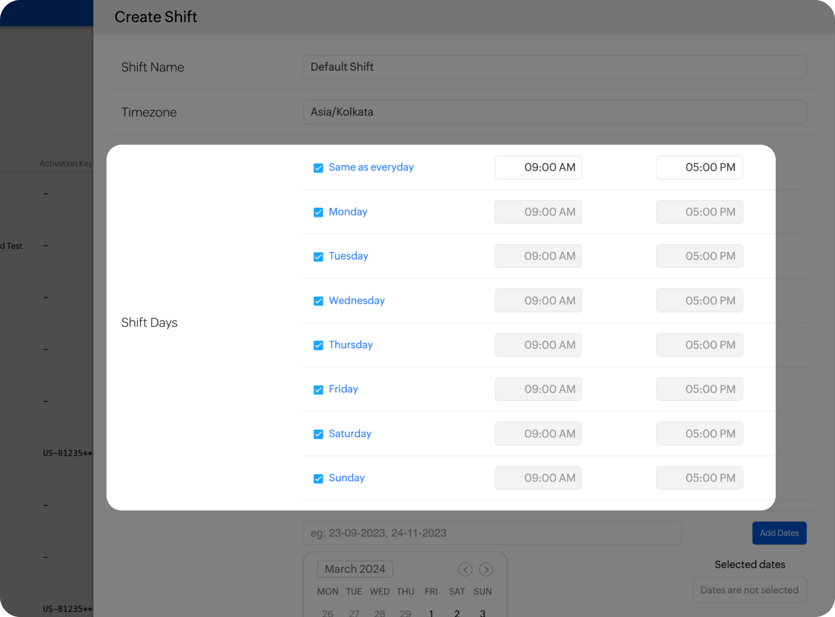 Select "Same as everyday" if the shift starts and ends at the same time everyday.