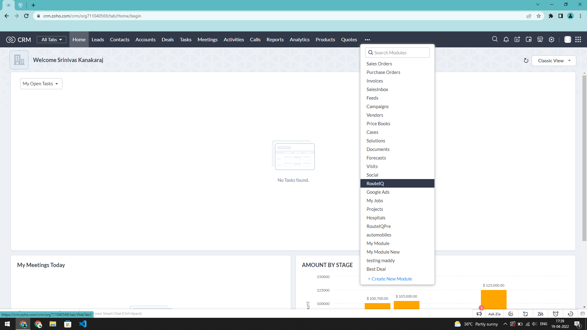 Click RouteIQ in the modules bar in Zoho CRM to open the RouteIQ webtab.