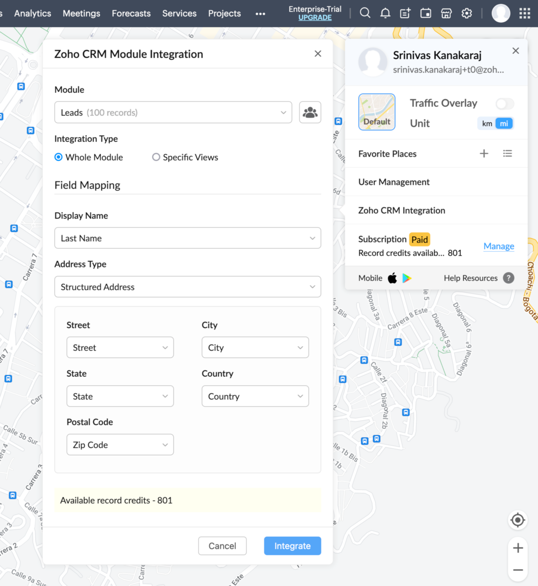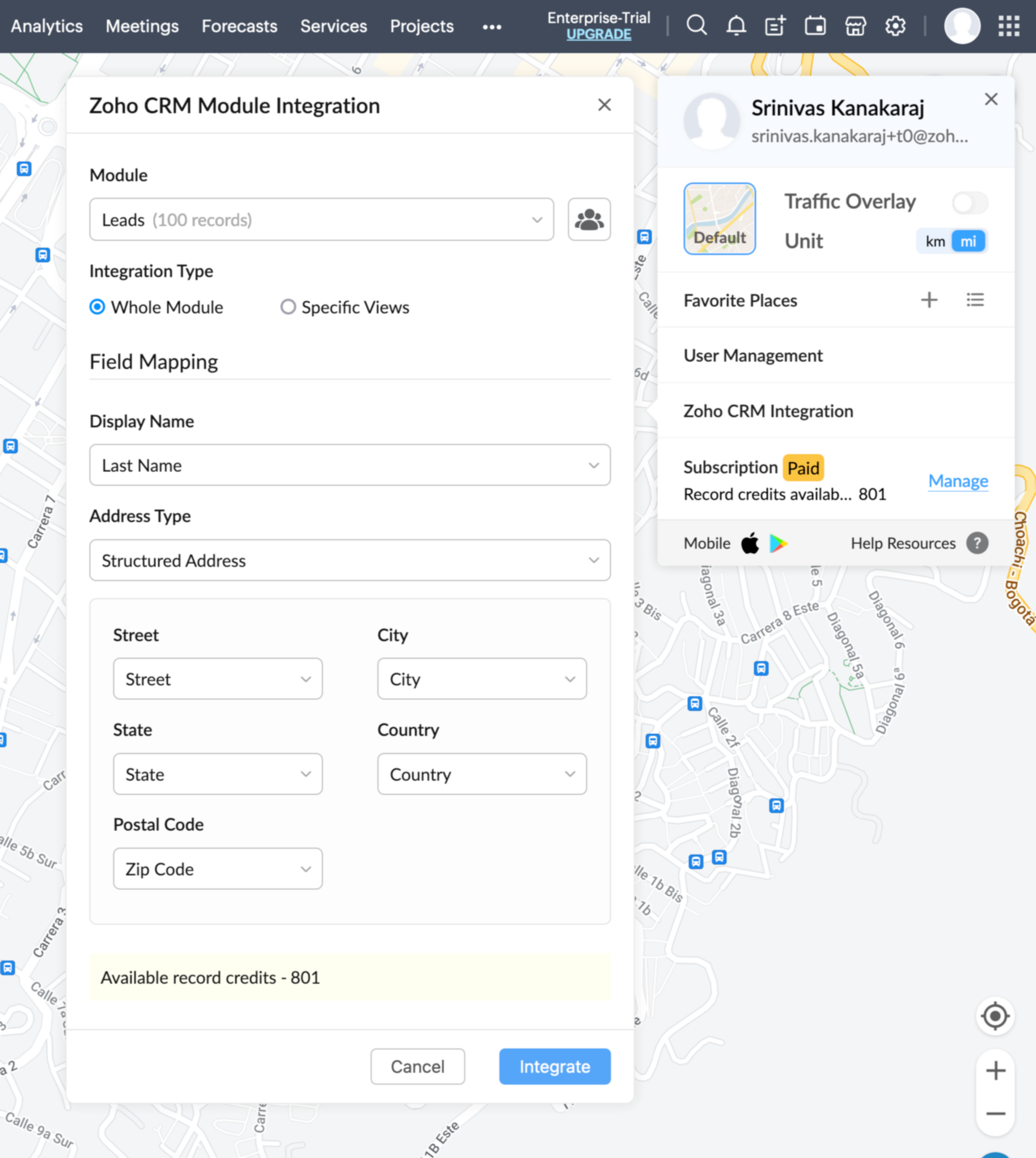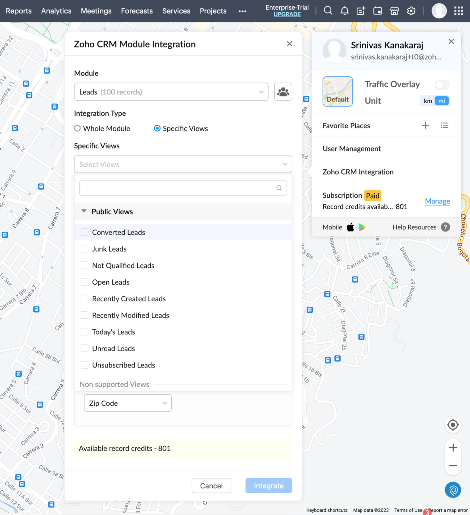 Integrating RouteIQ with Zoho CRM, is the process of connecting the modules and views of Zoho CRM with RouteIQ. After integration, you can visualize your prospects on a map and plan routes to visit them.
