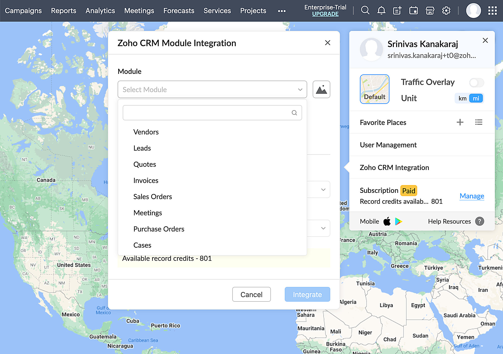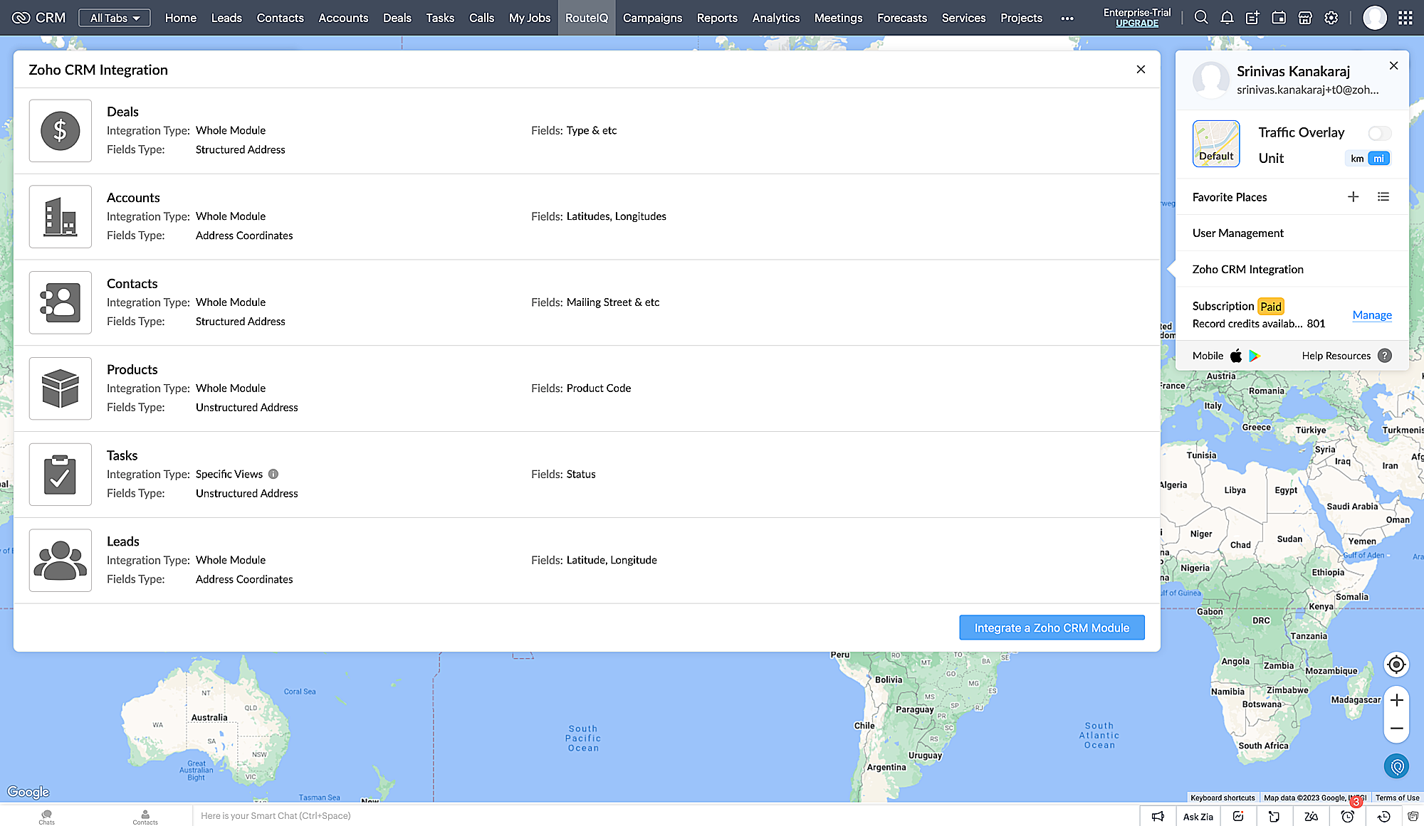 Module here refers to the default and custom modules available in Zoho CRM. After integrating RouteIQ with the required Modules, you can visualize the records on a map and plan routes to visit them.