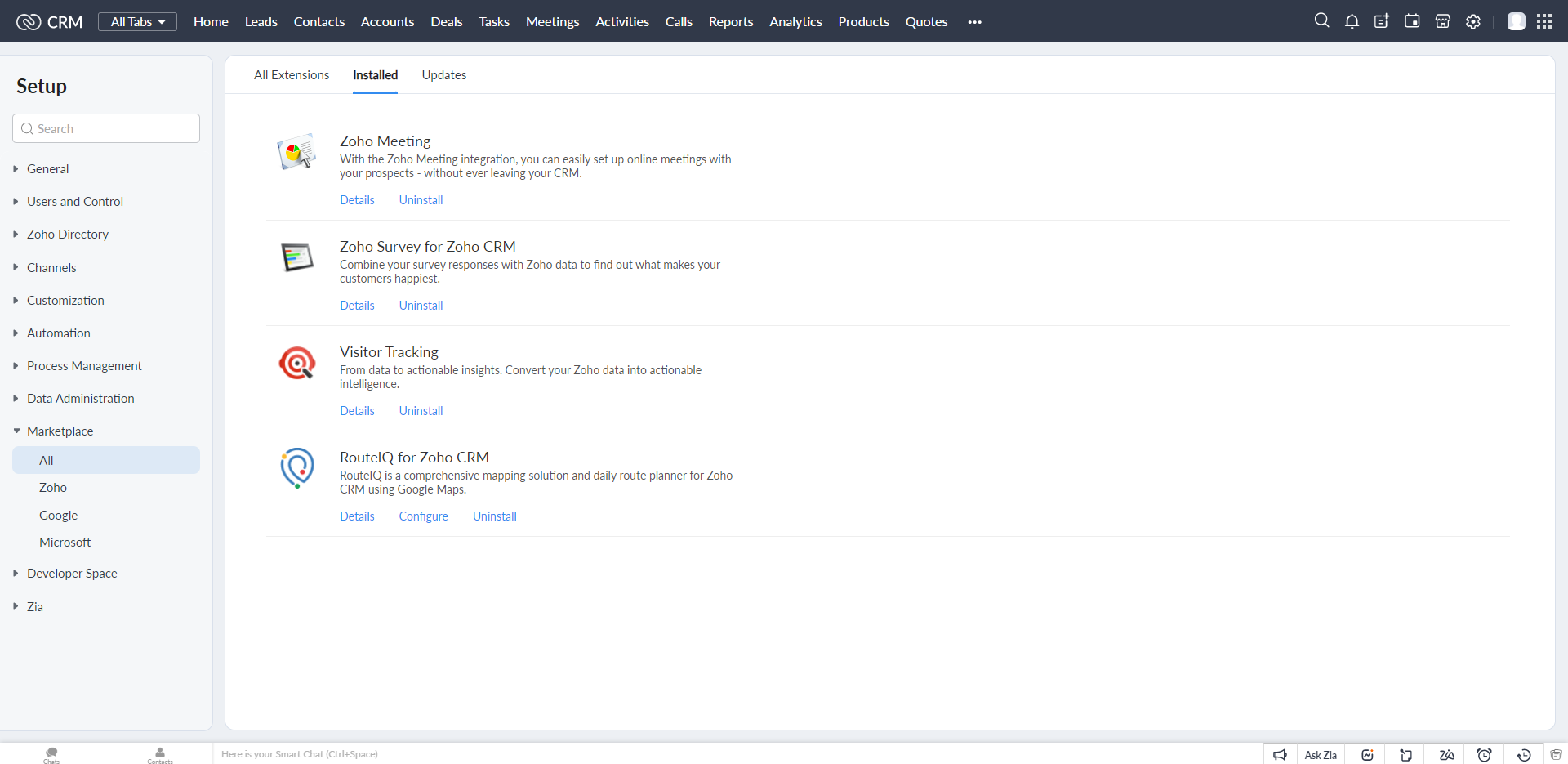 Click Configure under RouteIQ for Zoho CRM to open the configuration page for RouteIQ, where you can integrate Zoho CRM Modules & Views with RouteIQ.