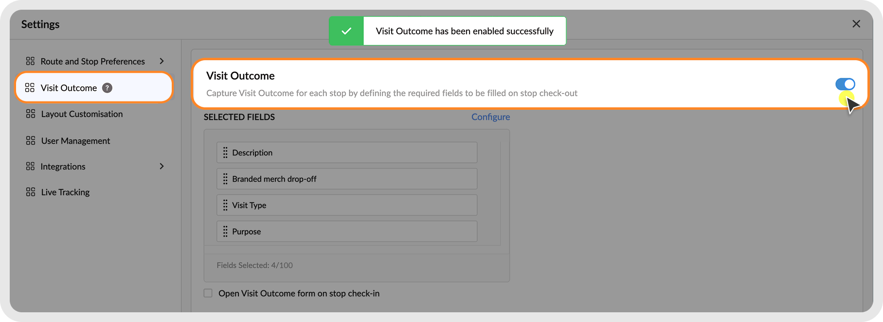 2. Turn on the "Enable Visit Outcome" toggle.