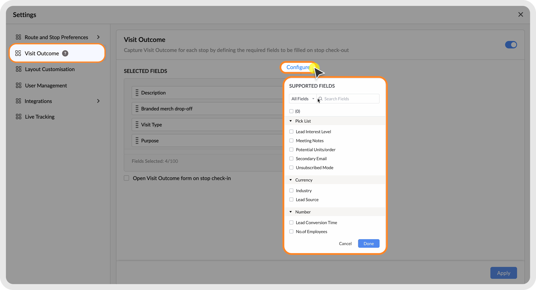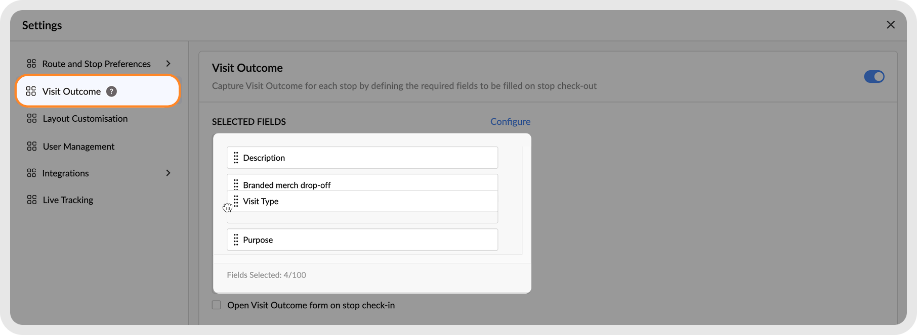 Visit Outcome helps RouteIQ users record custom post-visit information directly from within the RouteIQ app, without switching to Zoho CRM. Admins can configure CRM fields to appear in the Visit Outcome form during check-in or check-out. Visit Outcome lets RouteIQ users capture custom visit details inside the app (optional or required) shown at check-in/out, saving time and improving data accuracy. These fields can also be made mandatory, ensuring key details are always captured before a stop is completed. This streamlines data collection, improves accuracy, and saves time for field reps and managers. Here is how you can set up Visit Outcome for your organization.