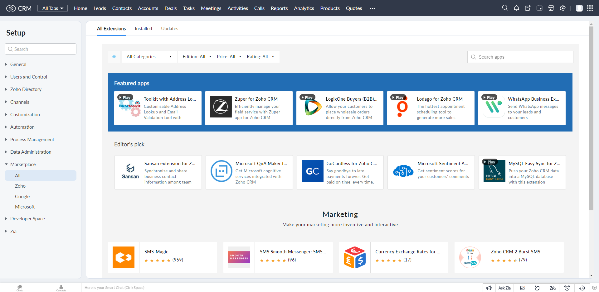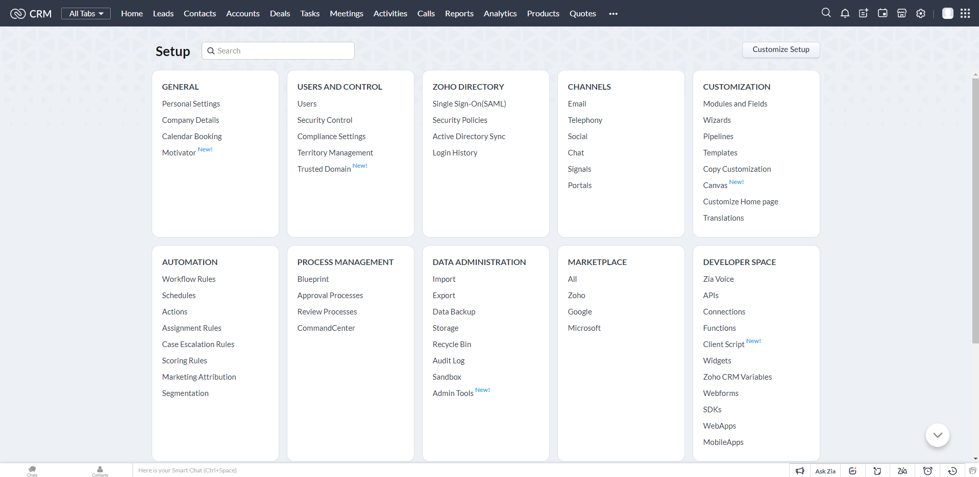 Open the Zoho CRM settings by clicking on the gear icon in the top-right corner.