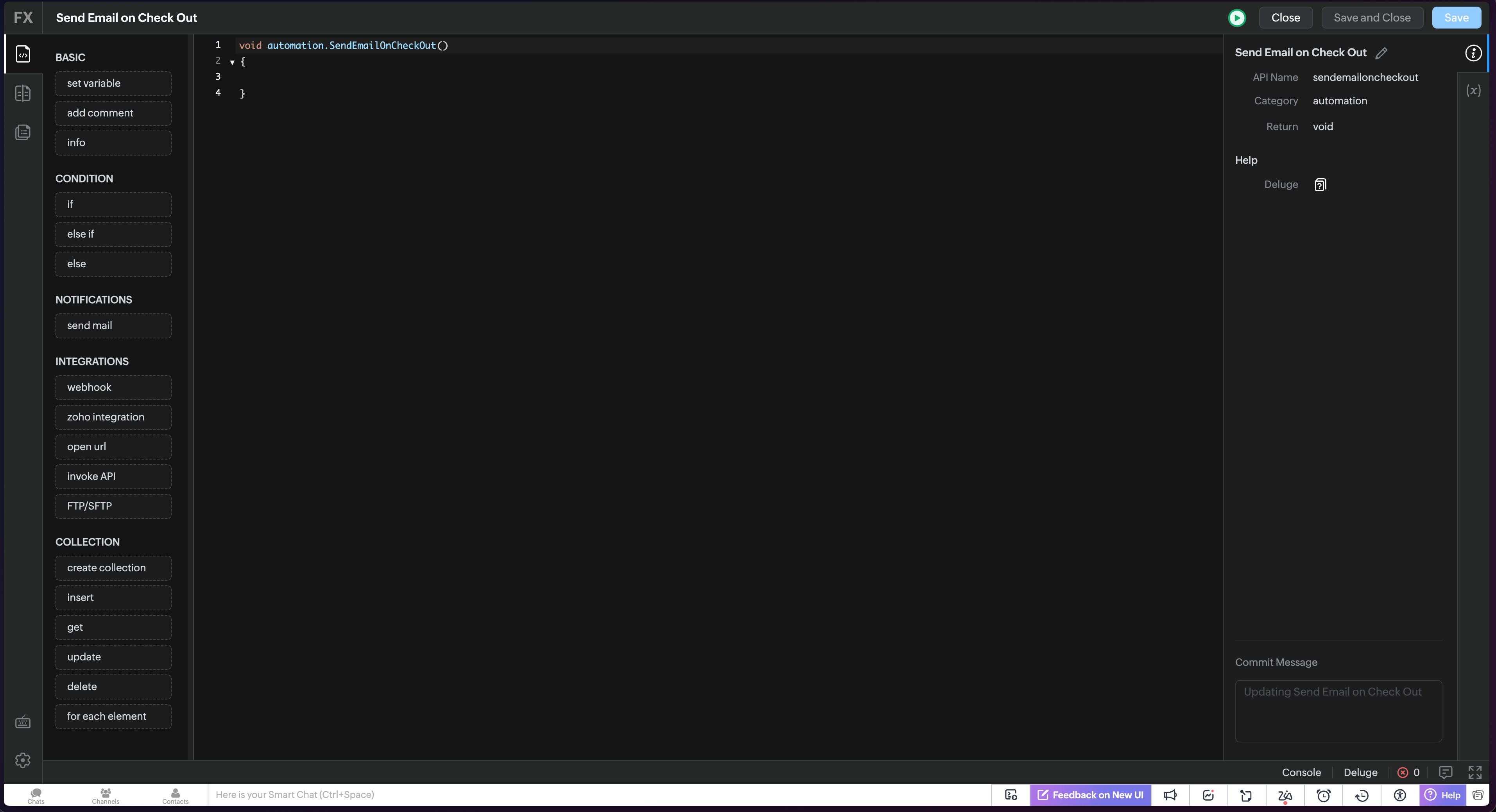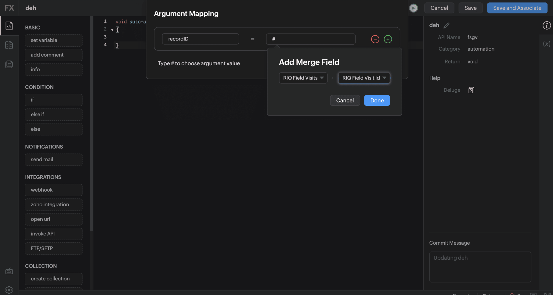 Note: Line 10 needs to have a list of all RIQ integrated modules - api names and their respective email / phone fields - field api name. We recommend adding/removing the values within this collection based on the CRM modules integrated with RouteIQ. Write your own email/SMS triggering logic from line no 16.8. Click "Save and Associate" and once you're back on the original page, click "Save".