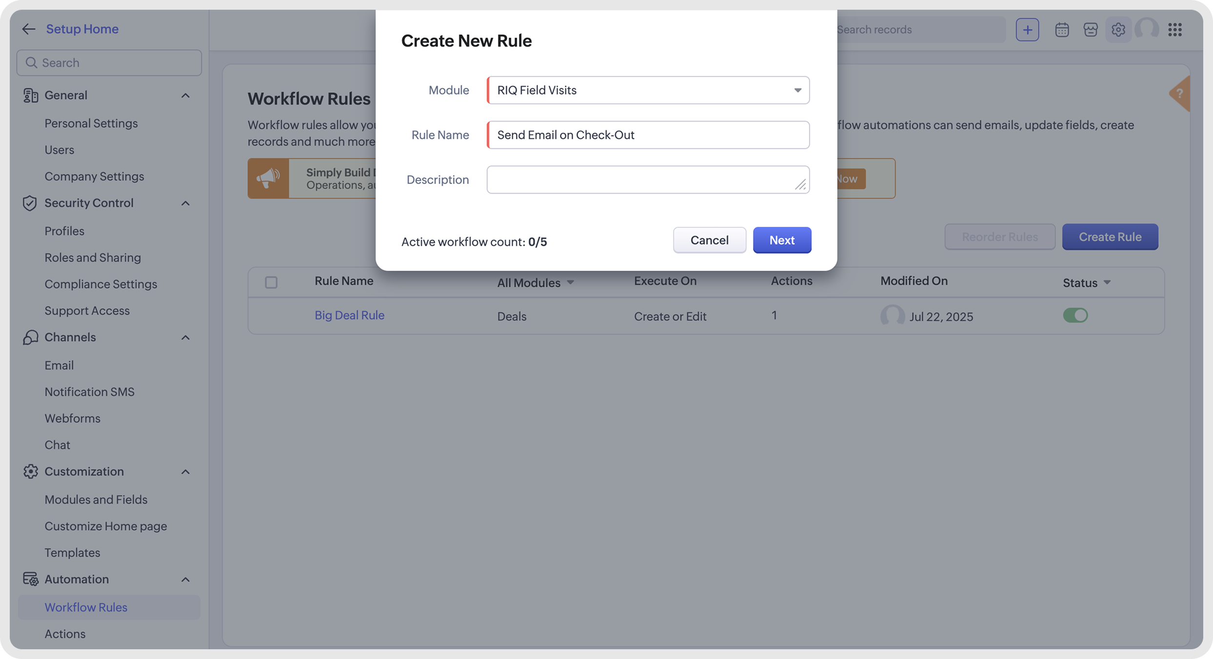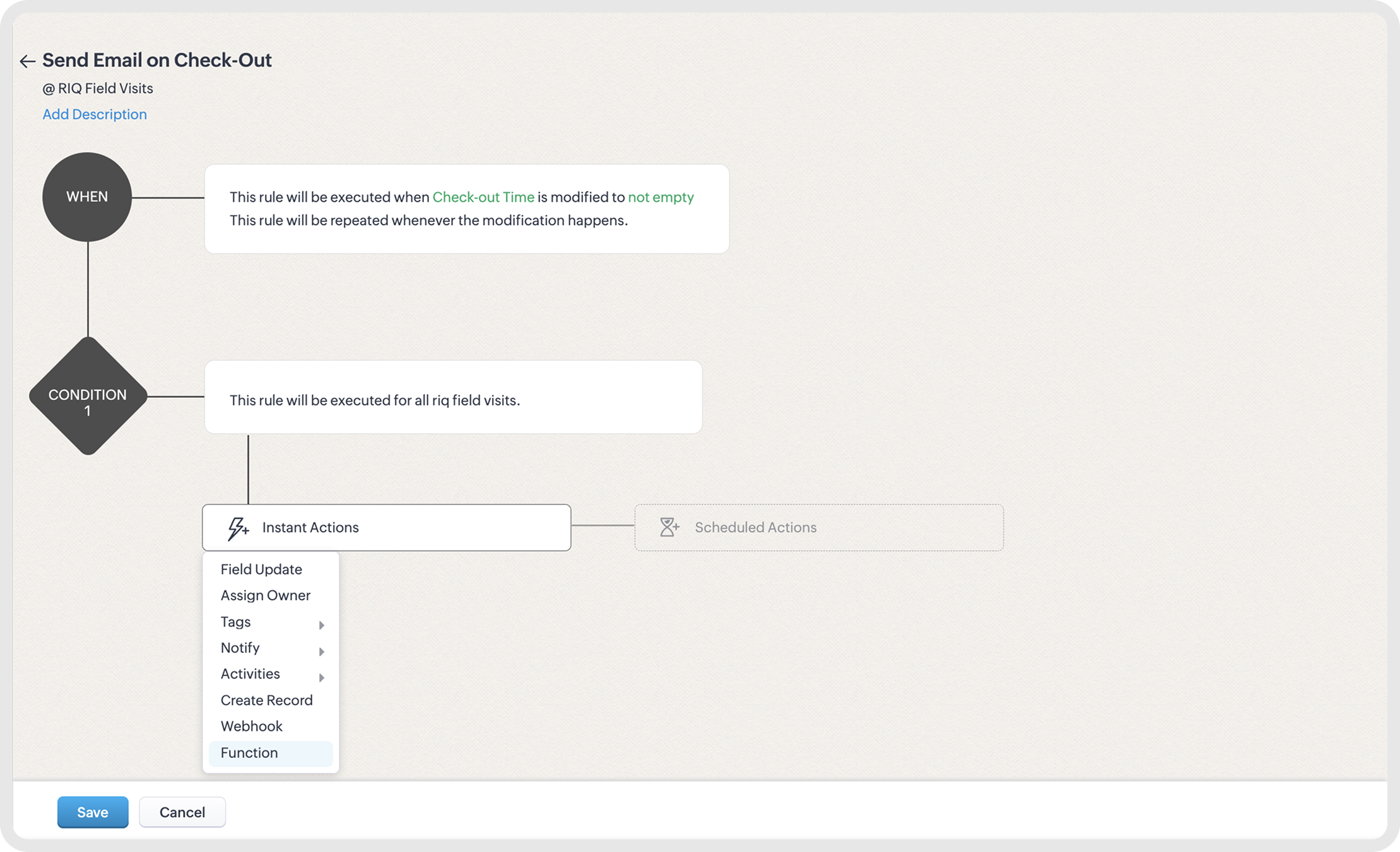 Now, let us see how you can do the same to send an SMS or email to intimate the next customer that the field rep is en route to visit them.