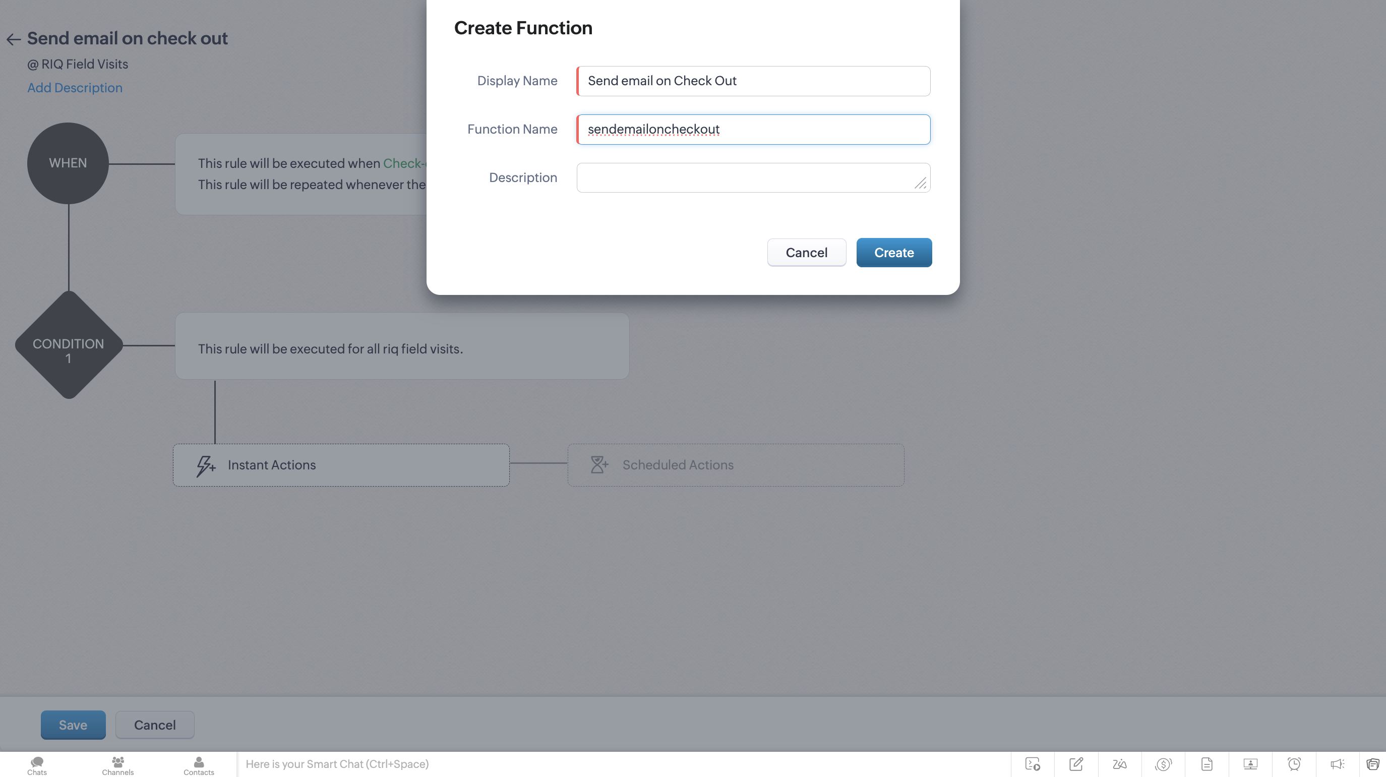 Note: RouteIQ does not have any SMS / Email vendors in place. To be able to use this function, you have to have an integration setup either through Zoho Marketplace or other vendors of your choice. For further help in this area, please contact support@zohocrm.com and our team will guide you with the process.This helpdoc is an example of how data can be taken advantage of to automate your business processes. Learn more on where and what details does RouteIQ send to Zoho CRM to get an idea on writing your own automations.