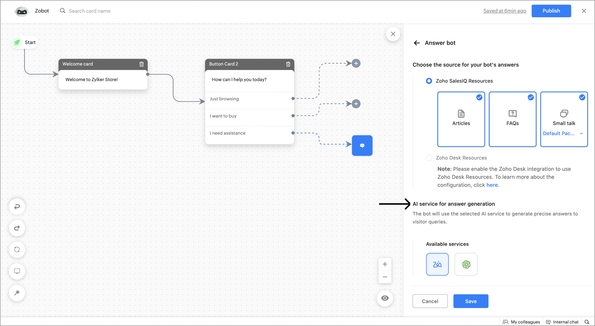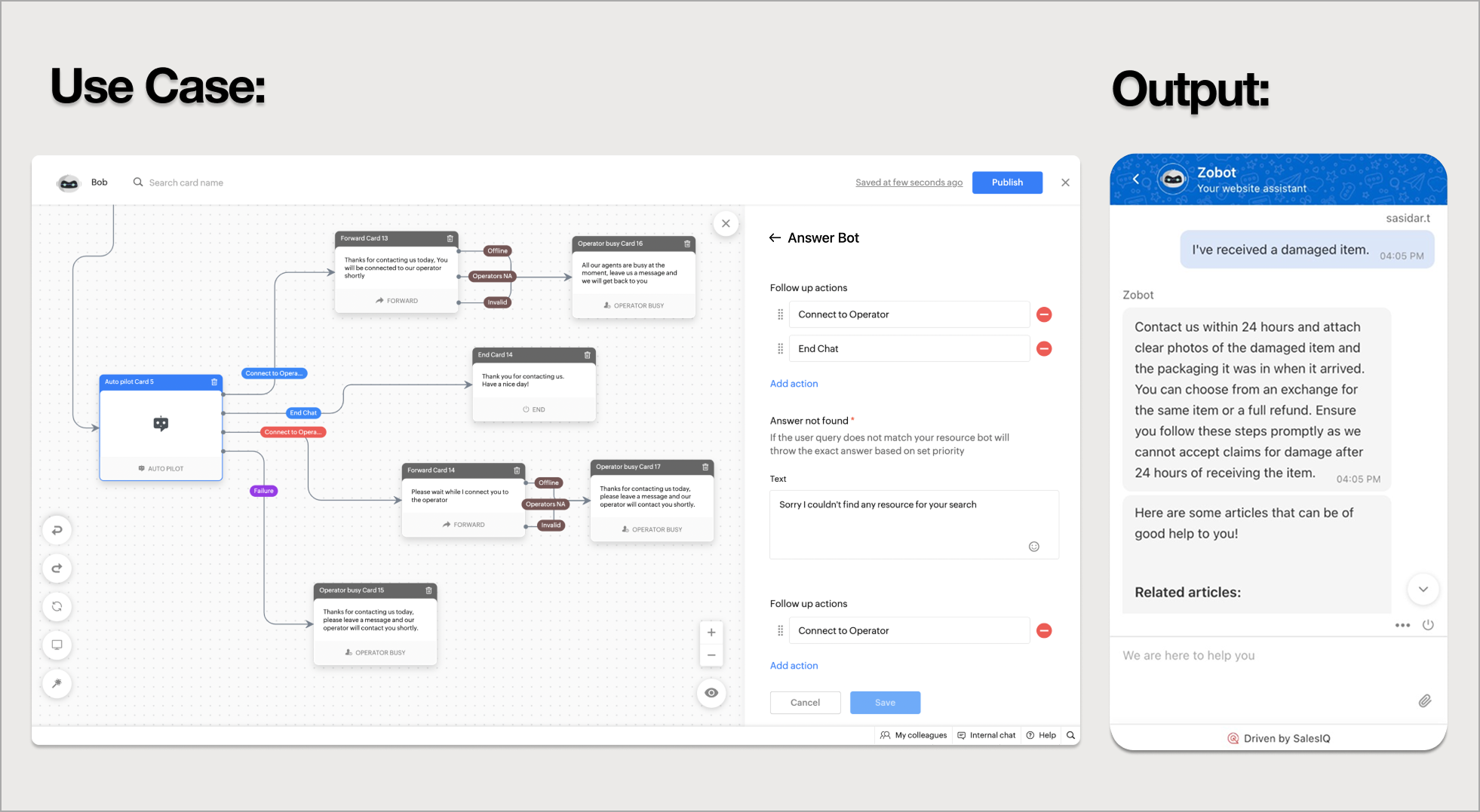 The Answer bot card behaves like the Answer bot, it displays articles and FAQs based on the visitor's question.