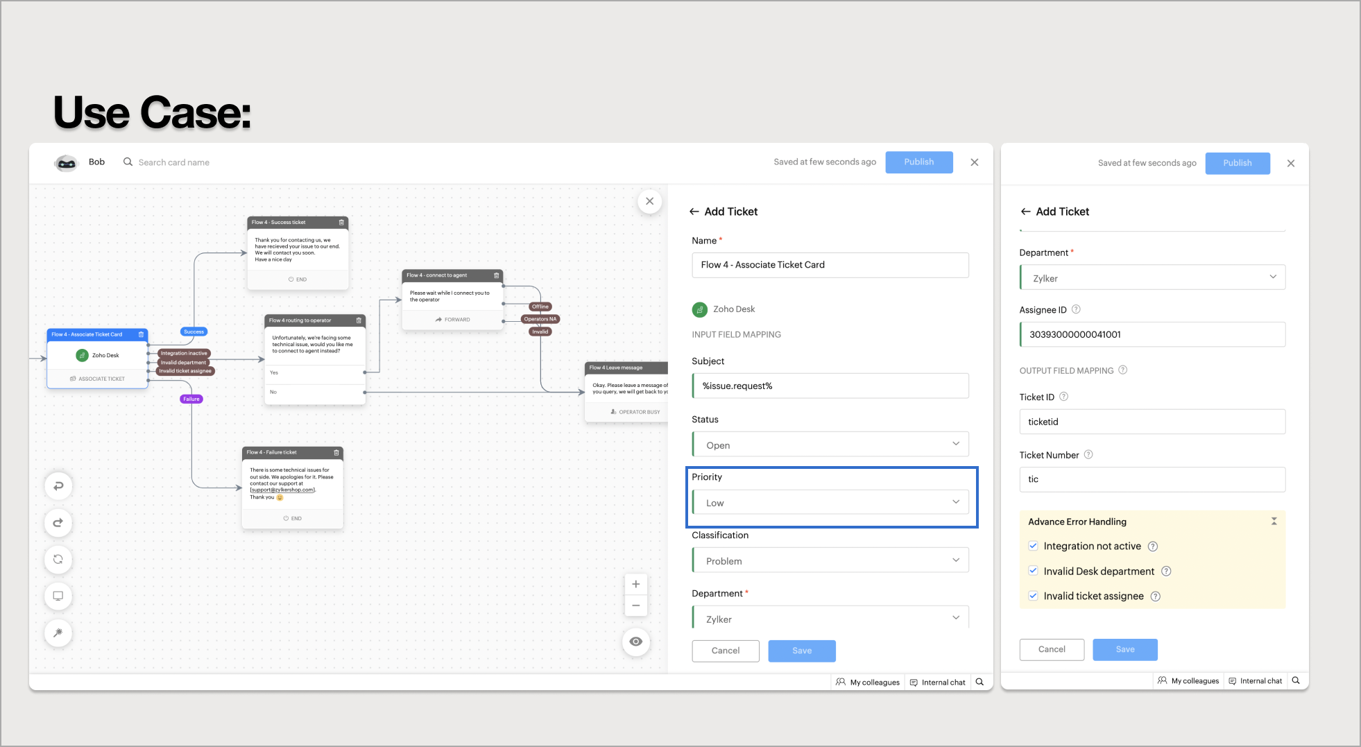 - Priority - Priority of the ticket, you can use either the inbuilt Desk priorities like High, Medium, Low, None, or bot context.