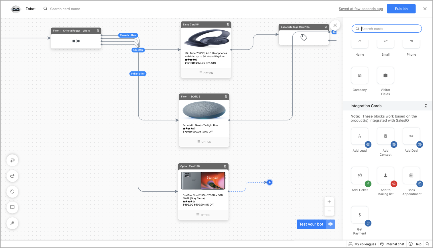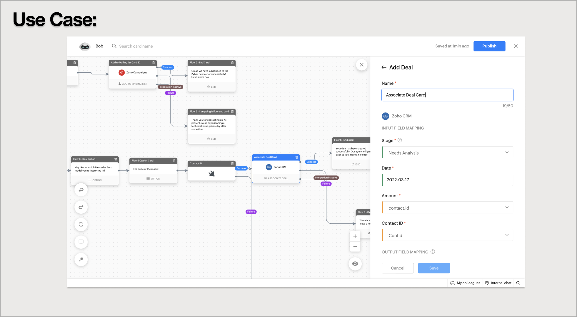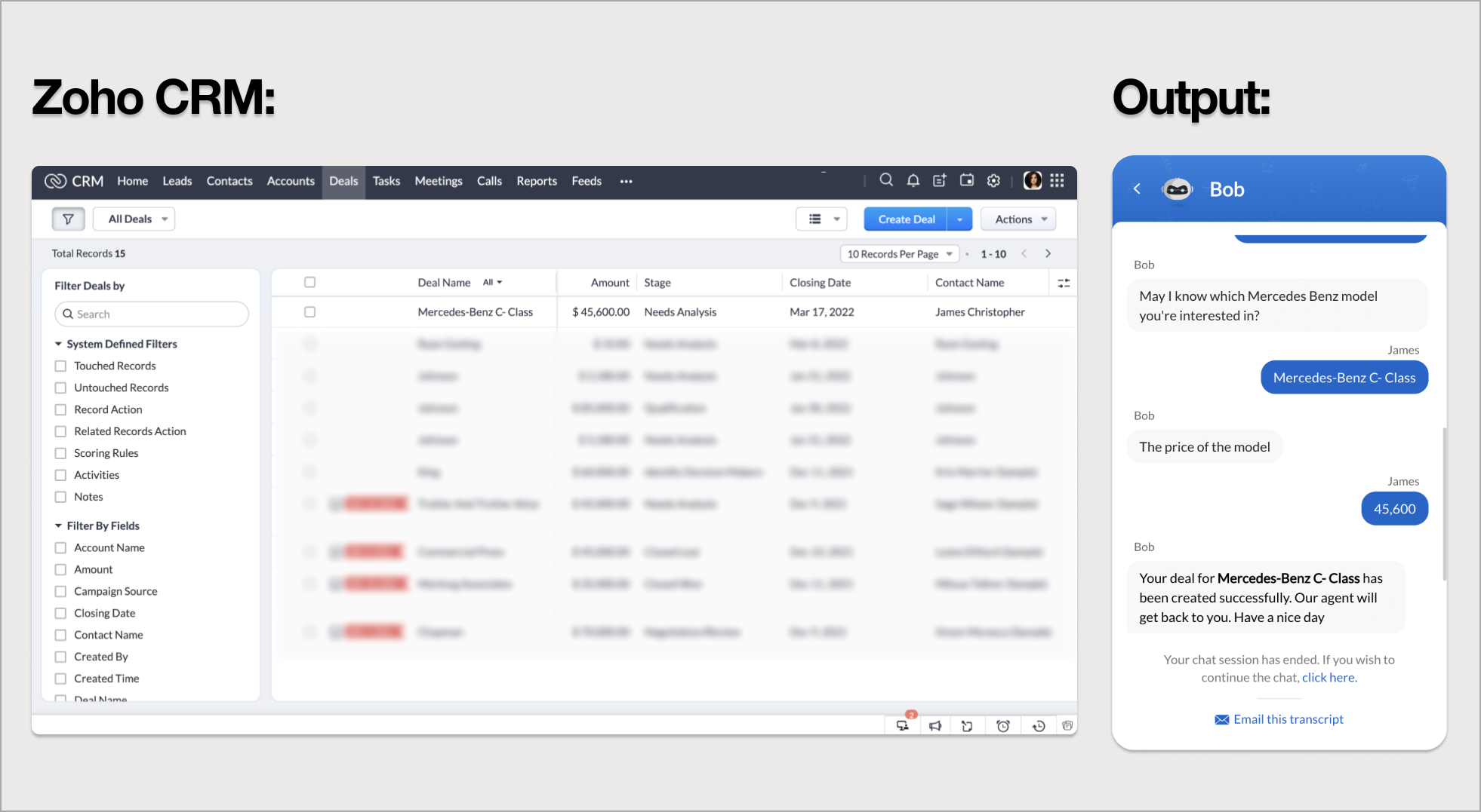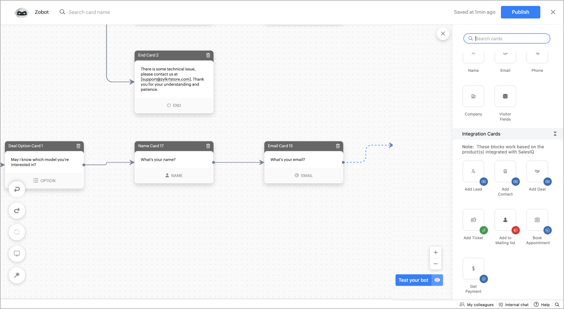 This card can be used to create a deal for the visitor. To use this card, Zoho CRM integration is mandatory.
