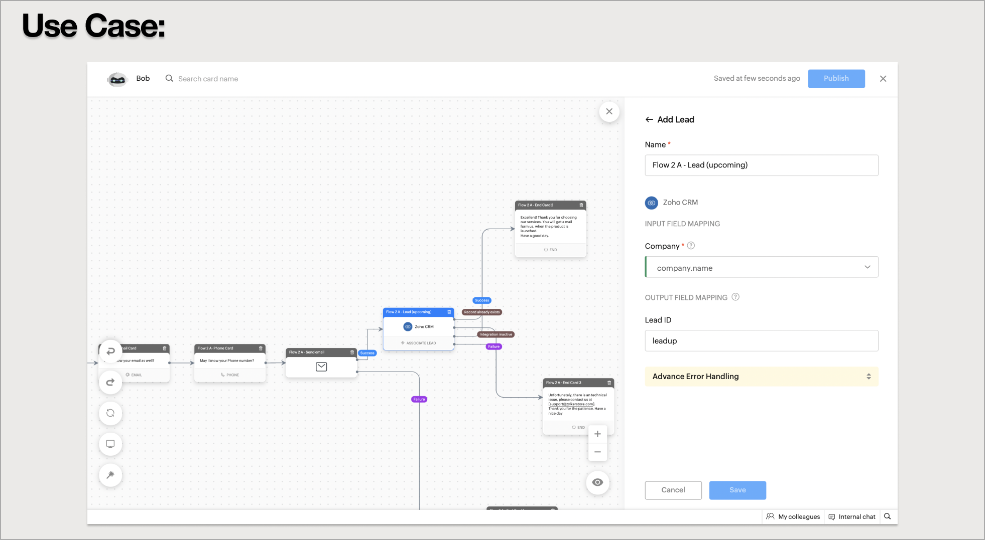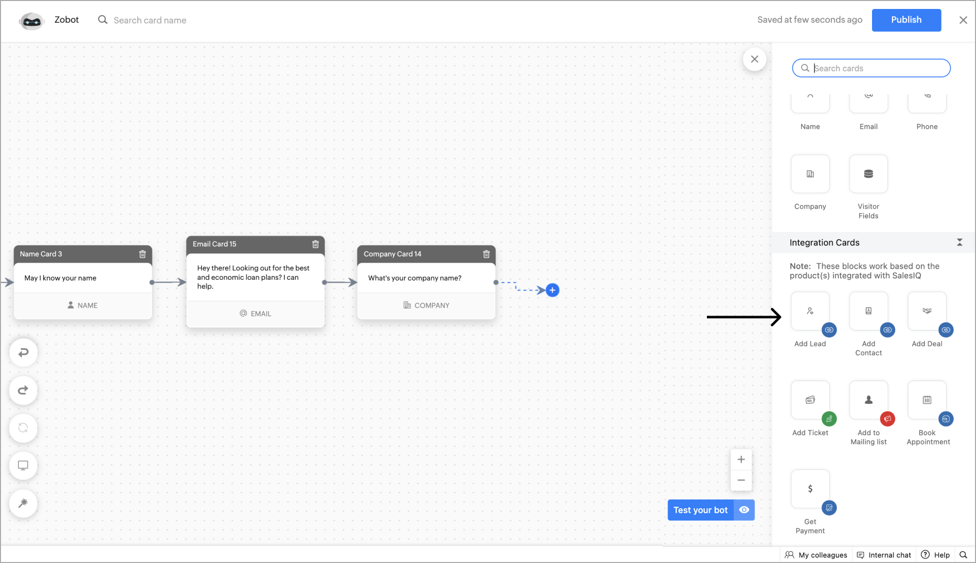 - To add the card to the flow, click on the cardholder icon (+) and choose Add Lead under the Integration Card section.