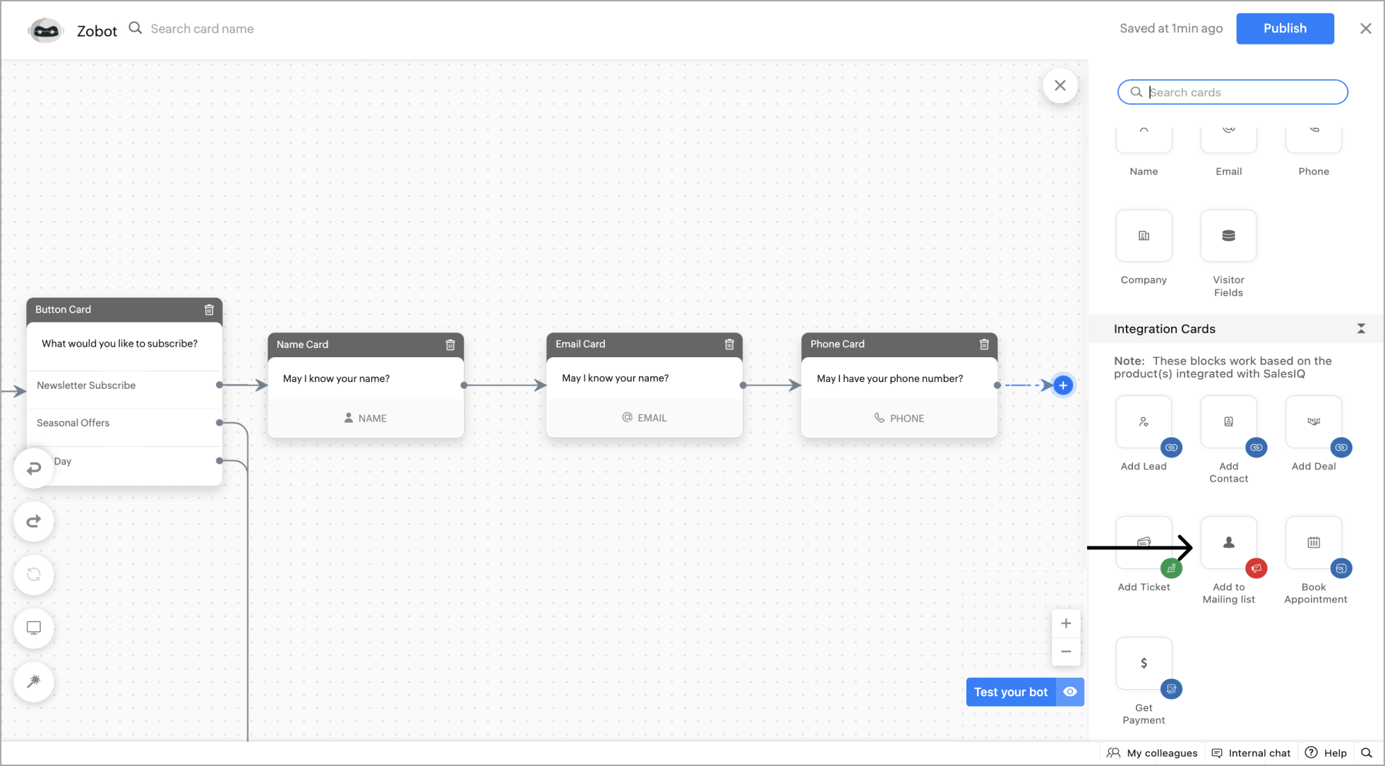 This card can add the visitors to integrated campaign services like Zoho Campaign. To use this card, Zoho Campaigns integration is mandatory. Once the card is activated the visitor will be added to the mailing list of the integrated campaign service.