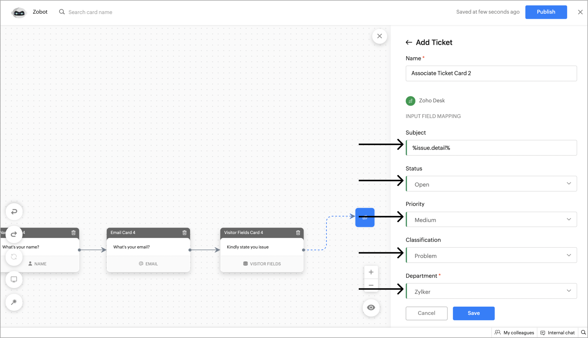 Example - Allowing visitors to create a ticket in Zoho Desk using Add Ticket Card. (%issue.request% - bot context for visitor's issue).